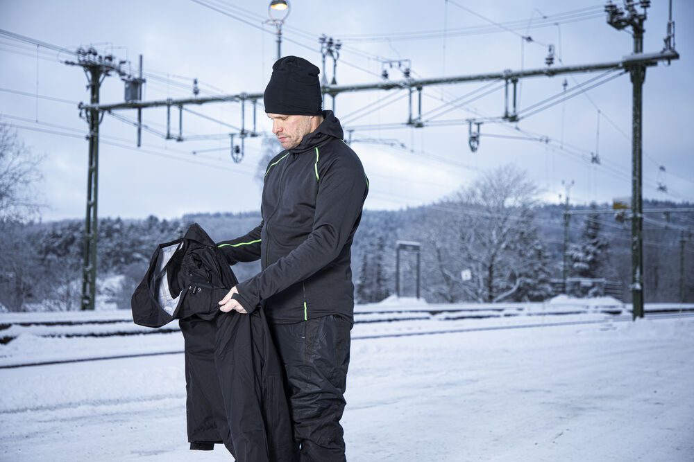 Chaqueta con capucha en material técnico que proporciona calidez y máxima libertad de movimiento y confort. Cremallera bidireccional en la parte delantera. Bolsillos laterales con cremallera. Dos bolsillos interiores. Capucha y cintura ajustables con cordón. Agarre para el pulgar en los extremos de las mangas.