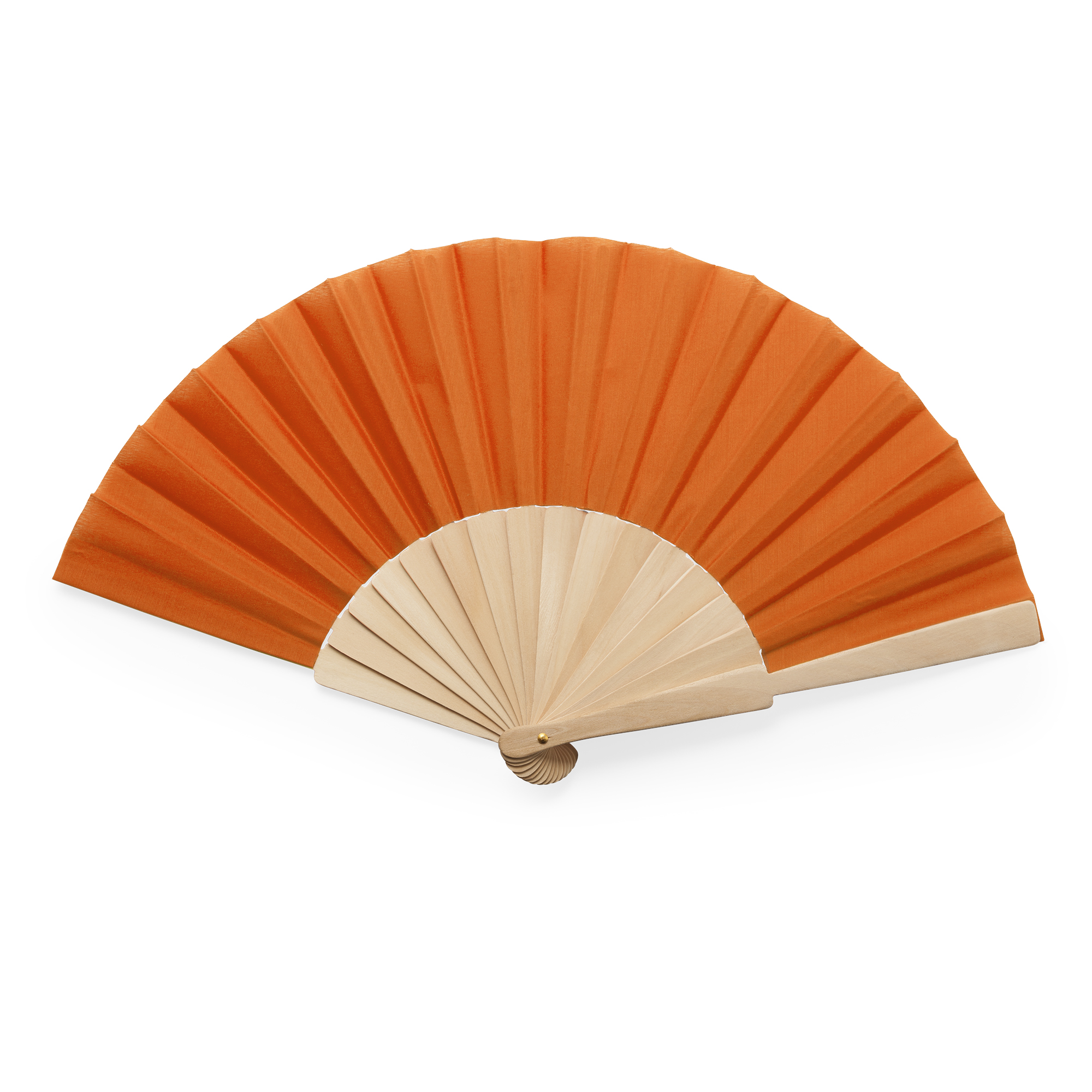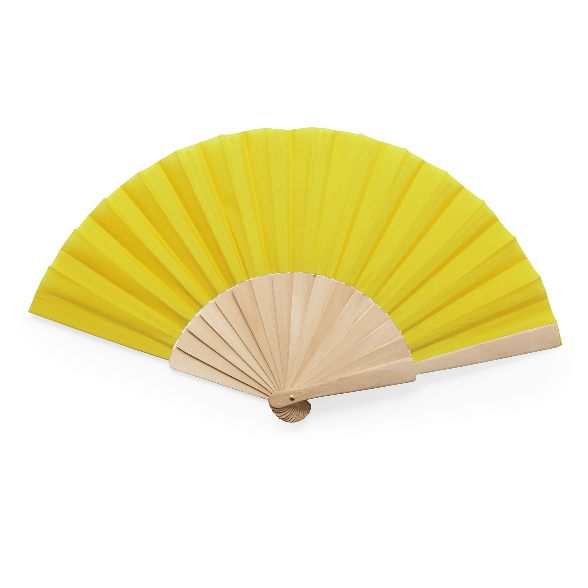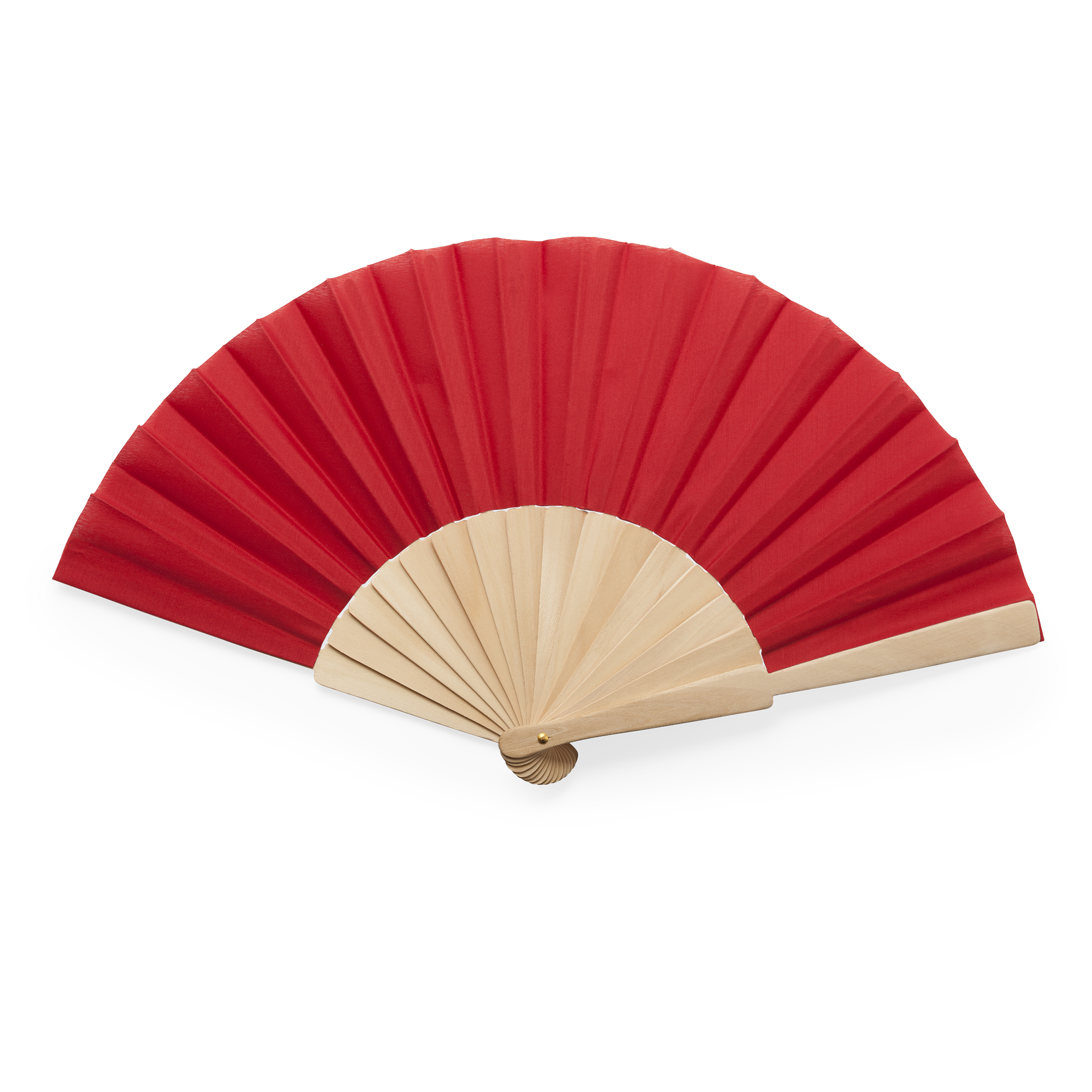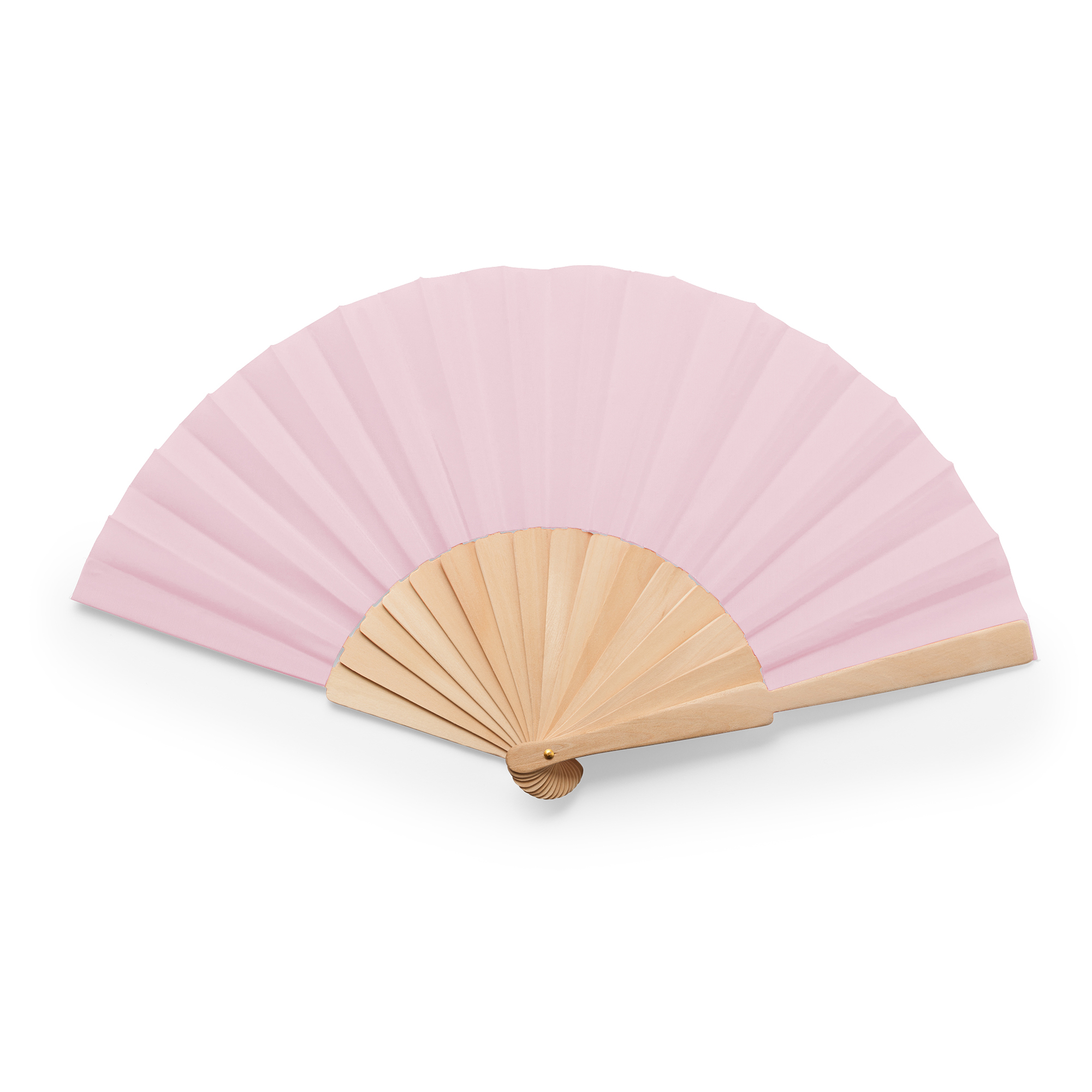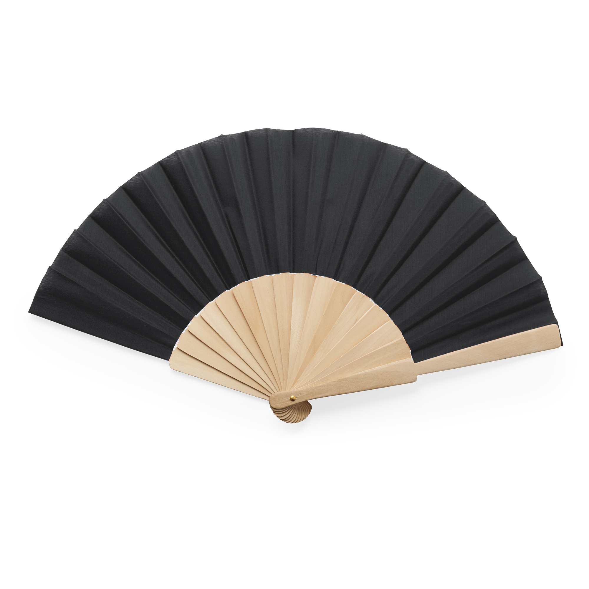 Abanico con varillas de madera y tela en poliéster. Presentación en caja blanca.