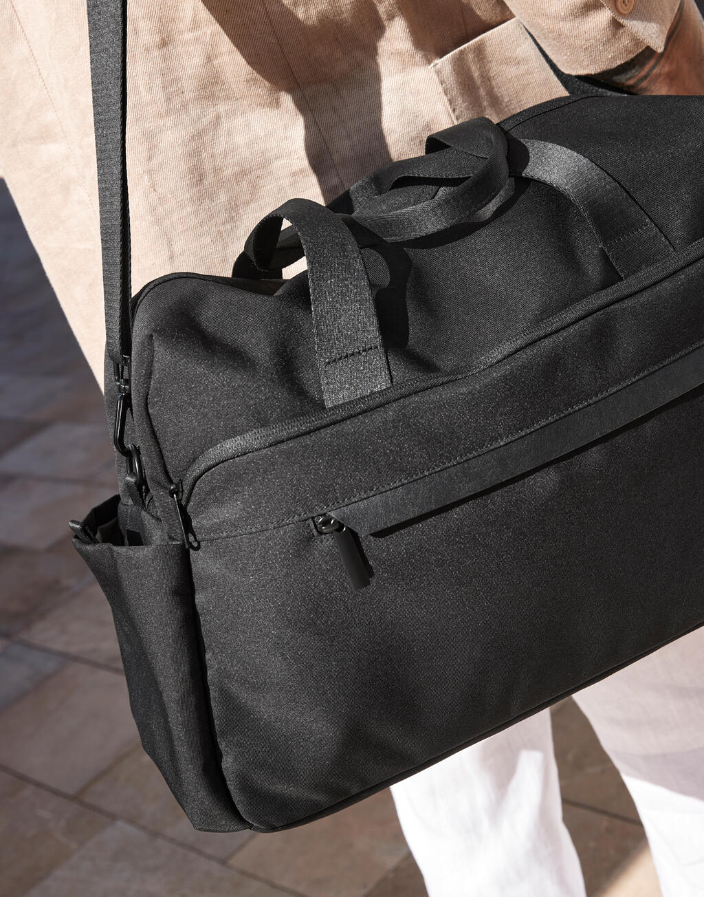 - El bolsillo trasero con cremallera funciona también como funda para deslizarlo sobre el asa de una maleta.