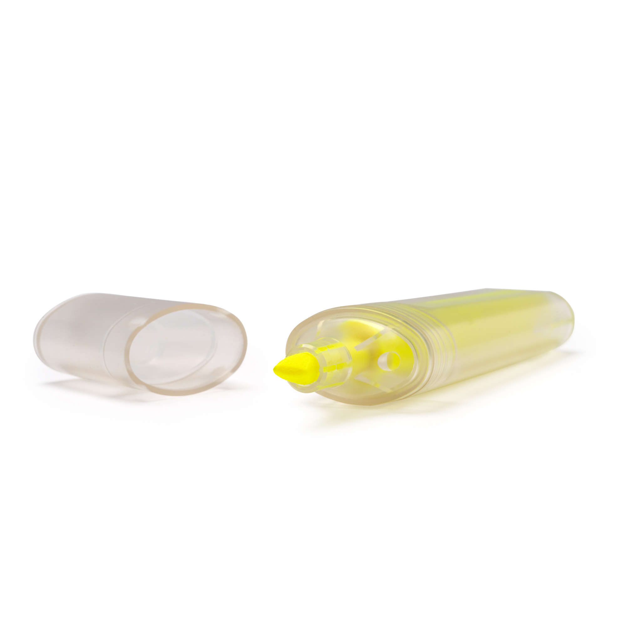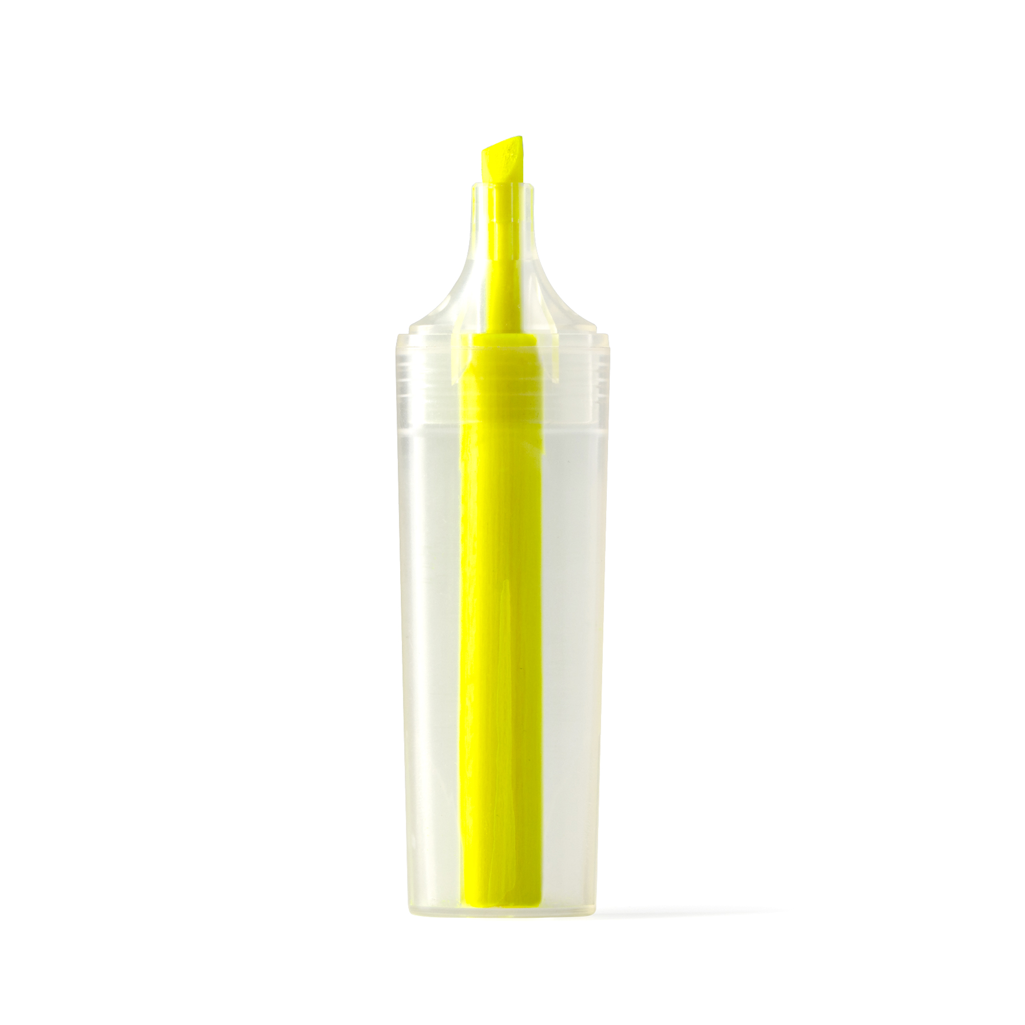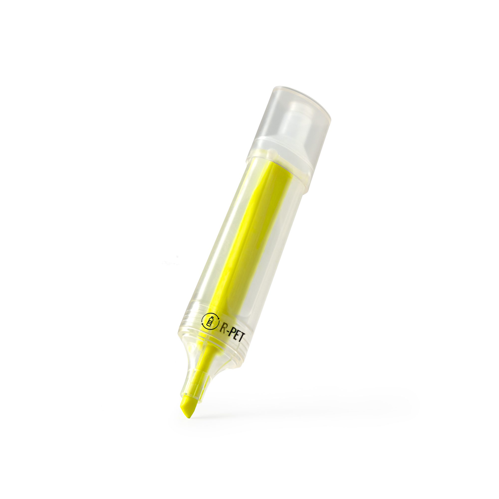 Marcador amarillo flúor realizado en plástico reciclado RPET con diseño traslúcido.