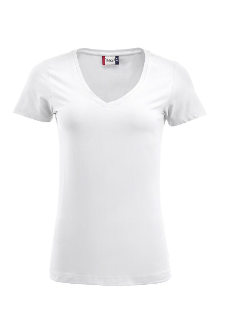 Camiseta elástica de mujer con amplio cuello de pico. Tejido de punto elástico. Canalé elástico. Costuras laterales.