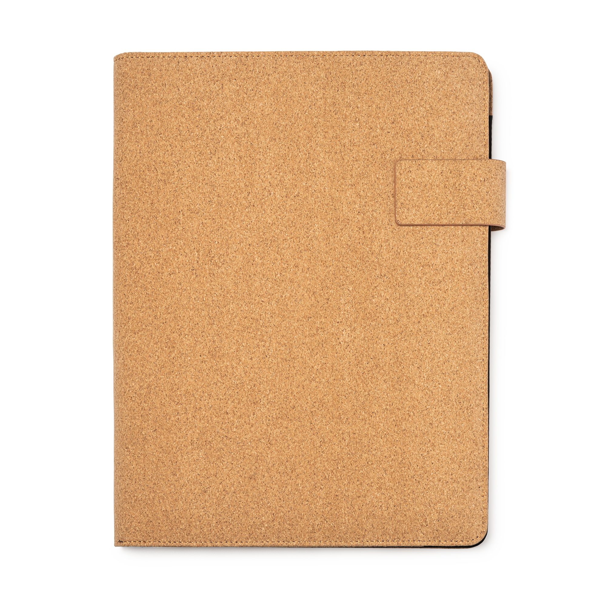 Carpeta A4 multiusos de corcho con cierre magnético. Incluye bloc extraíble de 30 hojas a una raya, 4 compartimentos interiores y soporte para bolígrafo.