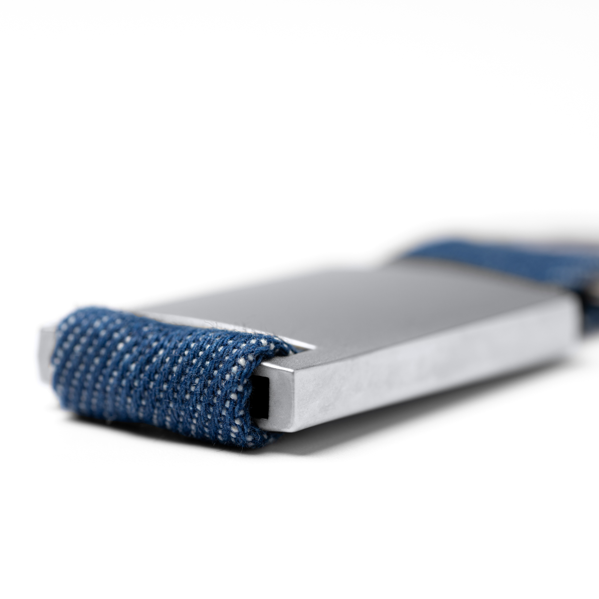 Llavero realizado en tejido vaquero con cuerpo metálico.