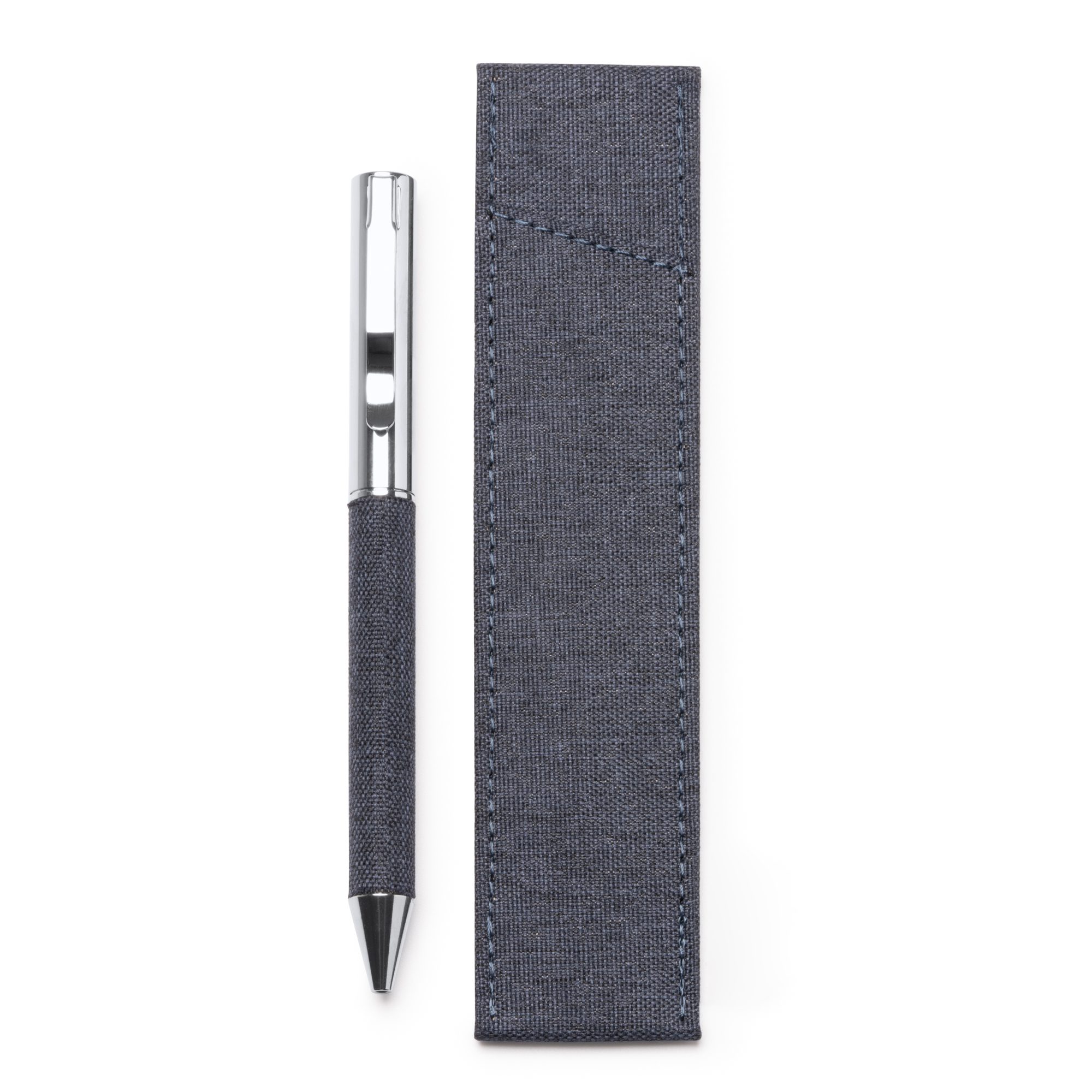 Bolígrafo giratorio realizado en metal y políester reciclado RPET. Tinta azul. Presentado en funda de poliéster reciclado RPET a juego.