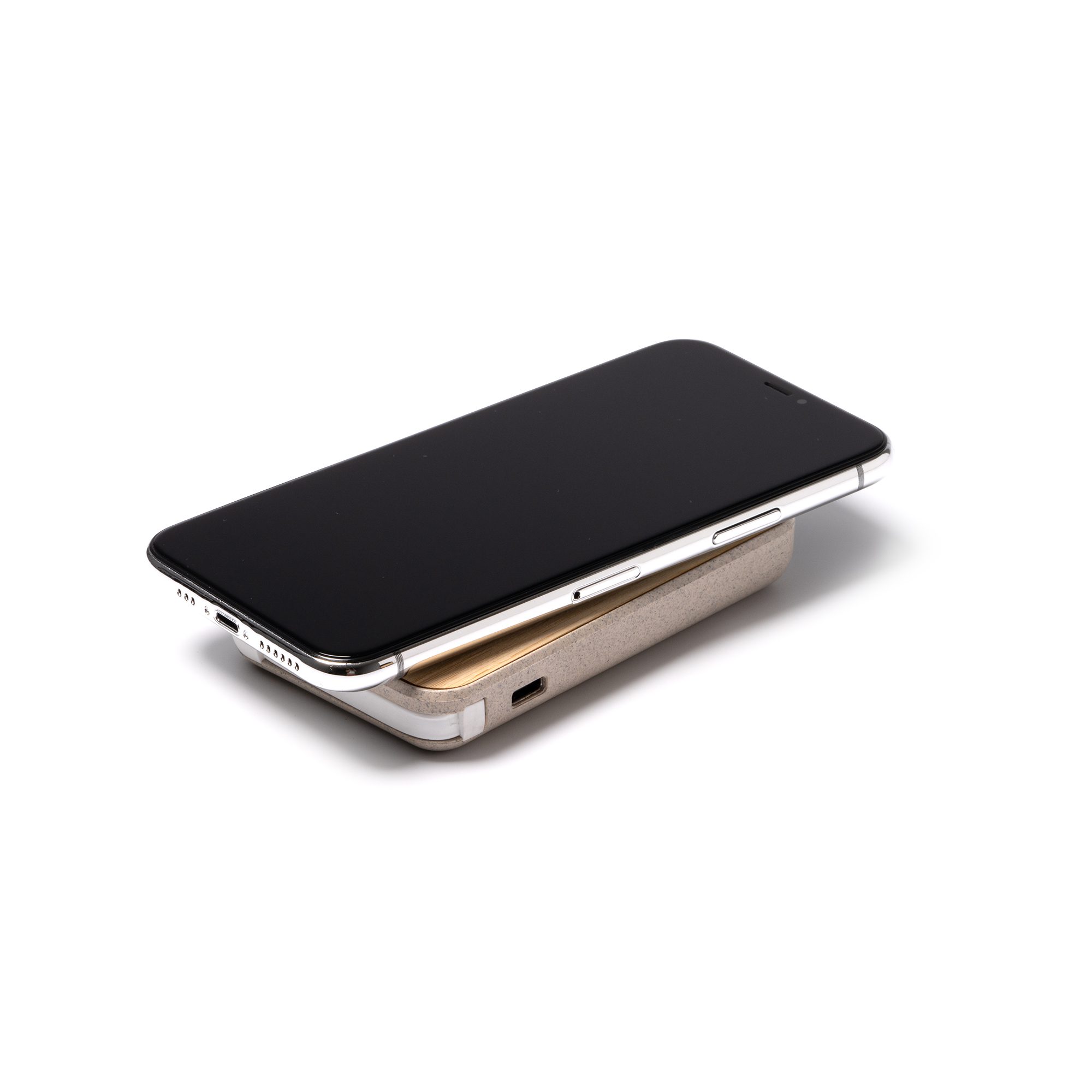 Batería externa de 5000 mAh con cuerpo de bambú y fibra de trigo. Con cargador magnético en la superficie para carga inalámbrica de dispositivos provistos de esta tecnología. Cuenta con soporte para smartphone en la parte trasera y cable tipo C integrado. Con indicador luminoso. Incluye cable Tipo C.
