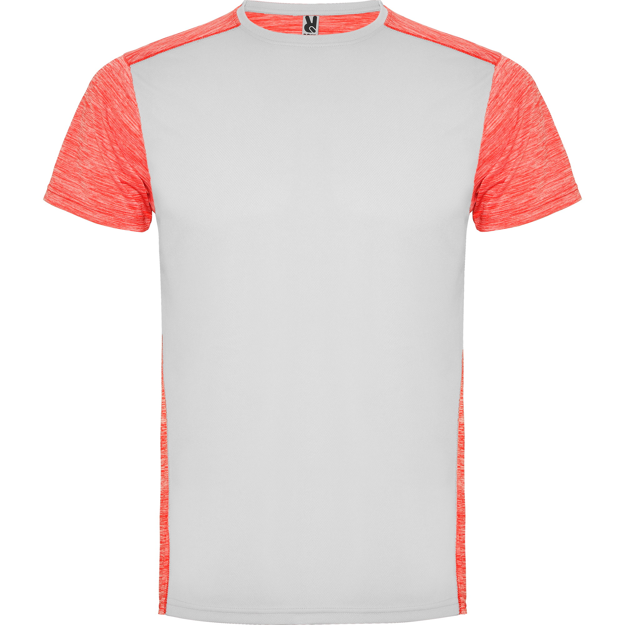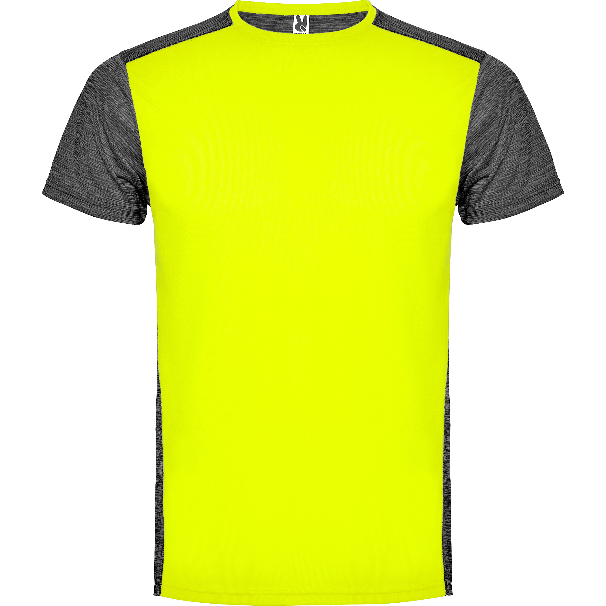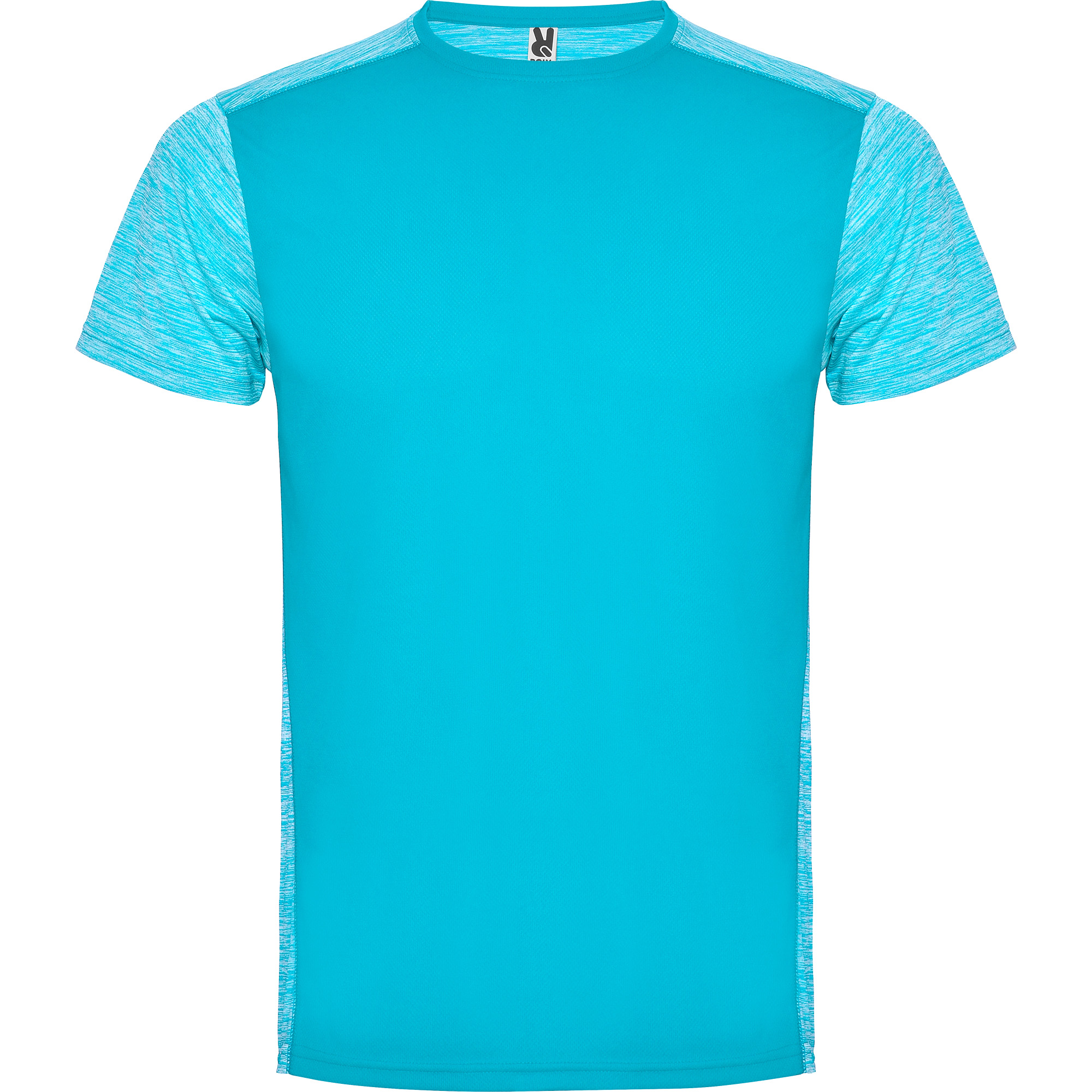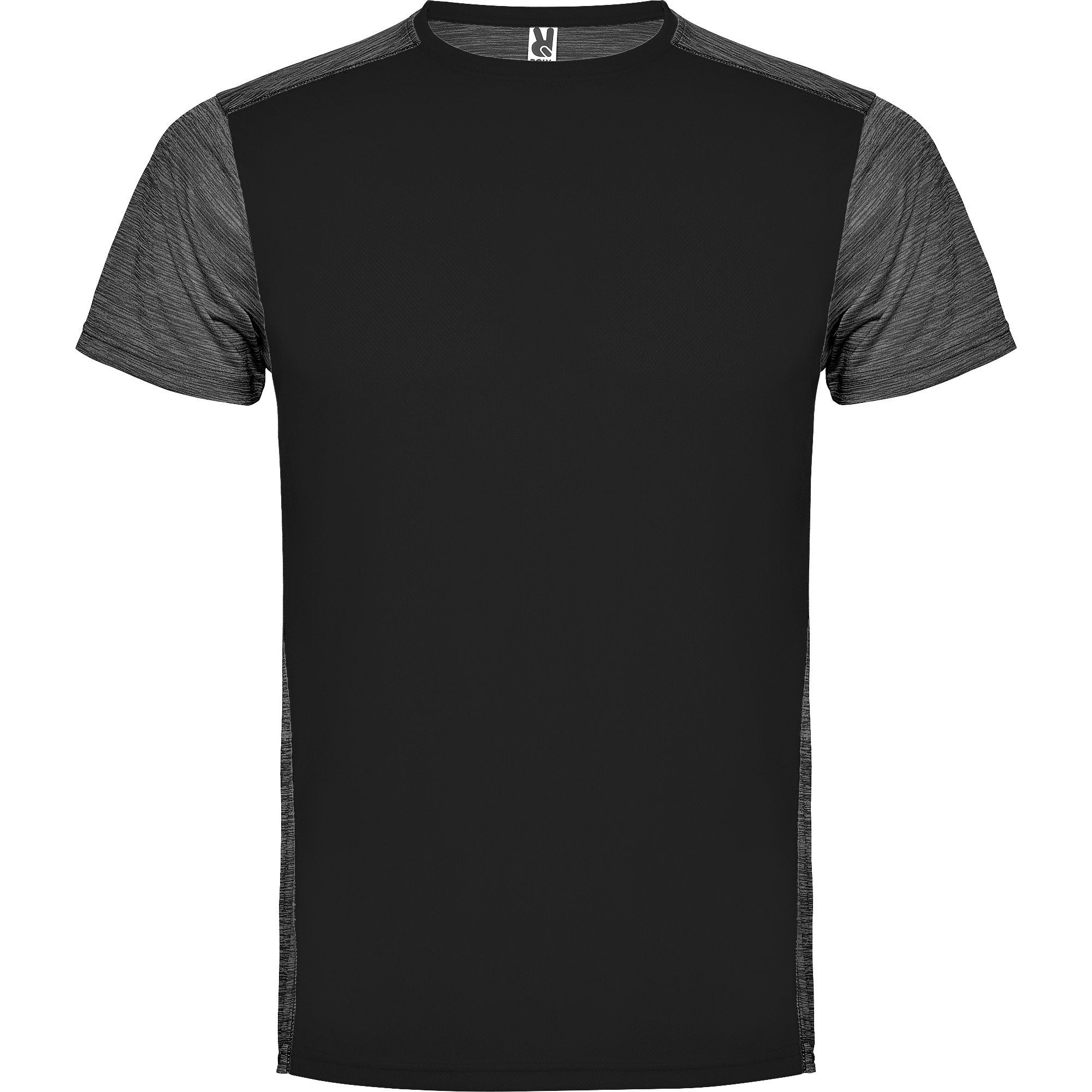 Camiseta técnica de manga corta con cuello redondo. Combinada en espalda, hombros y mangas con dos tejidos de poliéster. Tejido principal frontal bird´s eye y tejido space dye en la parte trasera. Patronaje en la espalda ligeramente mas largo.