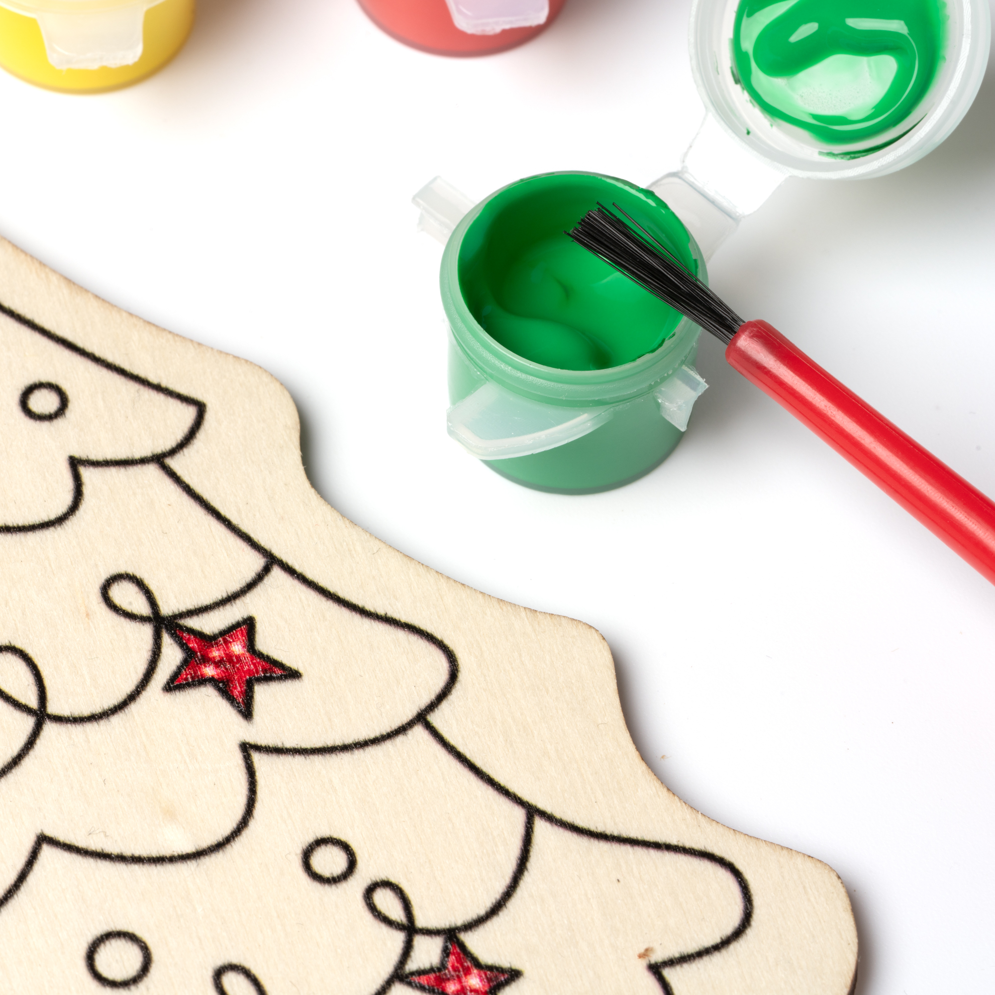 Set para colorear con diseño navideño en madera, que incluye pincel y tres pinturas. Ideal para que los niños exploren su creatividad durante las festividades.