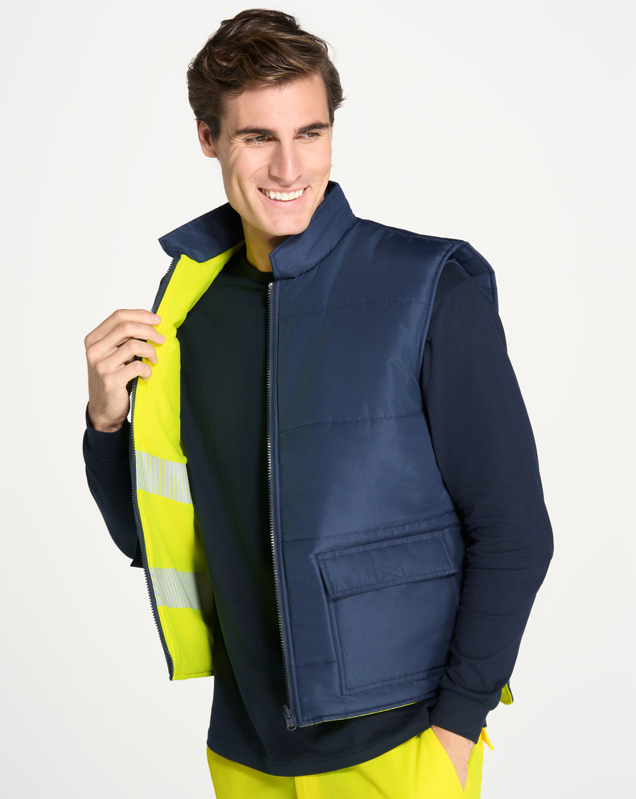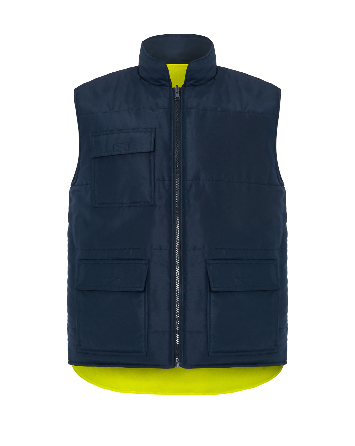 Chaleco acolchado reversible AV.Características:Cierre central con cremallera de tirador reversible.Cortavientos en sisa.5 bolsillos: 1 en pecho, 2 inferiores de cartera con cierre velcro y 2 abiertos laterales.Chaleco de alta visibilidad: Color flúor. Cierre central con cremallera de tirador reve