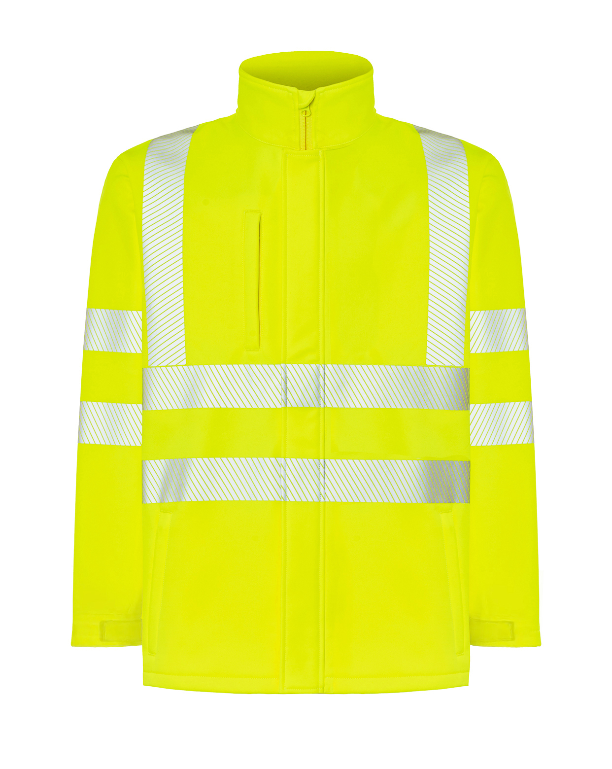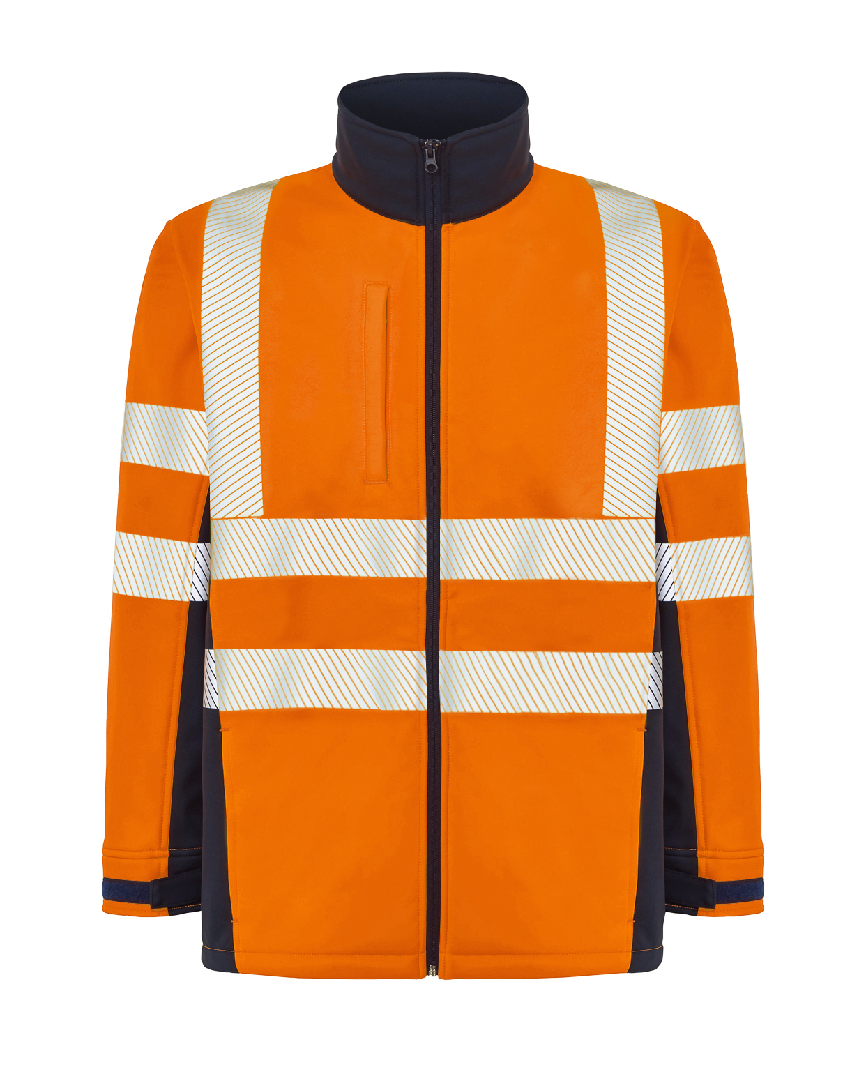 Chaqueta softshell AV.Características:Cierre central con cremallera y protector de barbilla.Puños ajustables con velcro.Cremalleras invertidas.Bicolor: Dos cintas reflectantes segmentadas, termoselladas en torso y mangas.Liso: Cintas reflectantes segmentadas, termoselladas en torso, hombros y mang