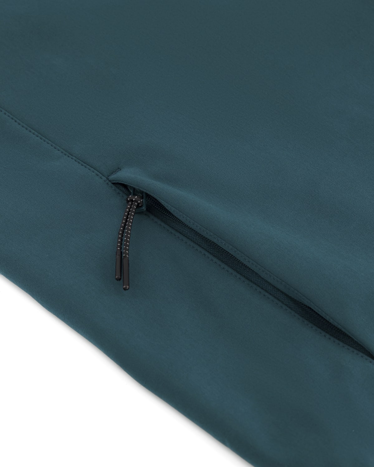 Cuello alto y manga pegada Bajo ceñido con cordón elástico y tope de plástico Cremallera de nailon invertida en el centro Bolsillos exteriores con cremallera y ribete y tirador elástico reflectante Forro polar interior integrado Paneles laterales elásticos para una mejor forma Mangas ceñidas con velcro ajustable Costuras interiores rematadas con ribetes reciclados Impermeable Transpirable y cortavientos