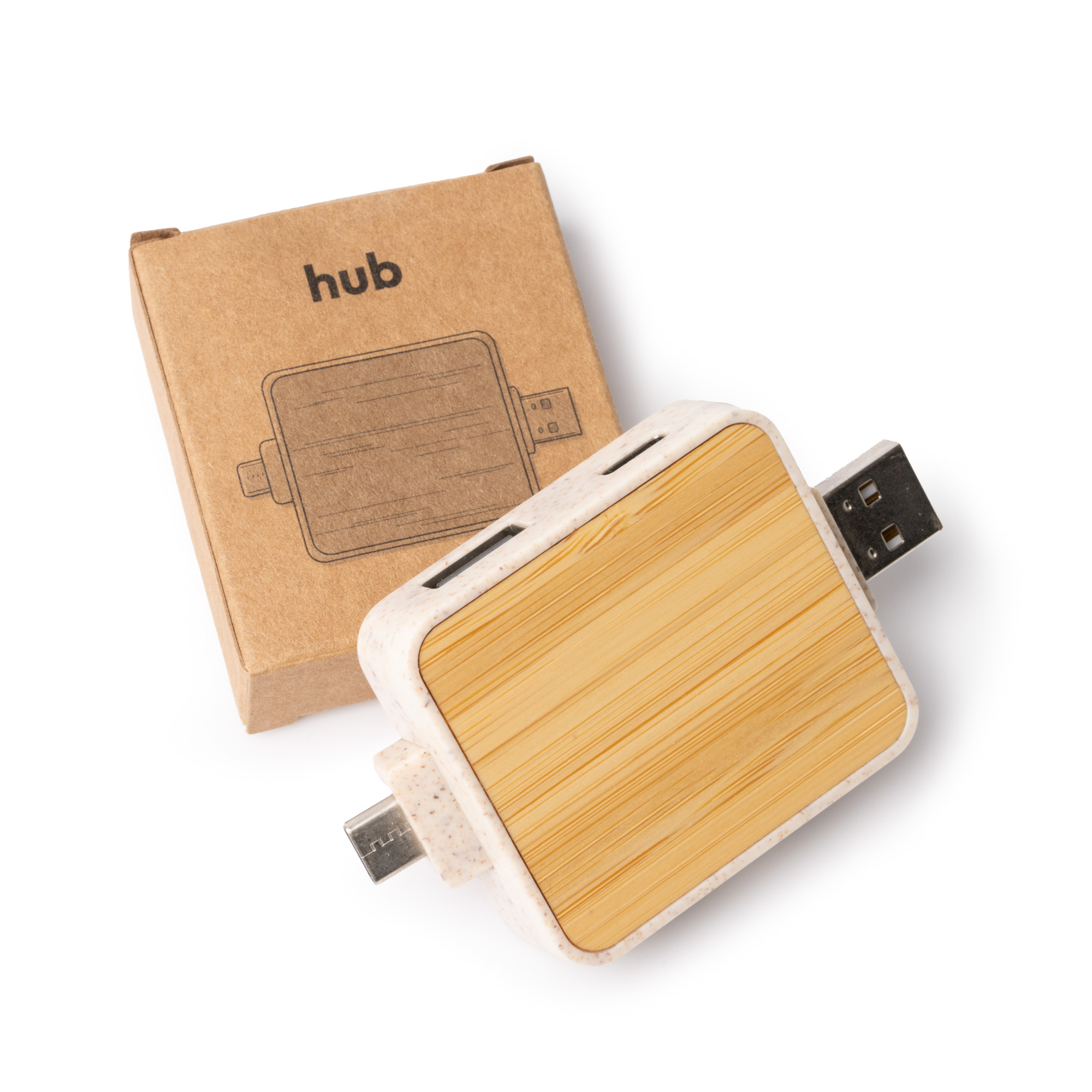 USB HUB con cuerpo fabricado en fibra de trigo y superficie de bambú. Con conexiones de entrada para 2 Tipo C y 2 USB. Las salidas Tipo C y USB son plegables, aportando mayor funcionalidad.