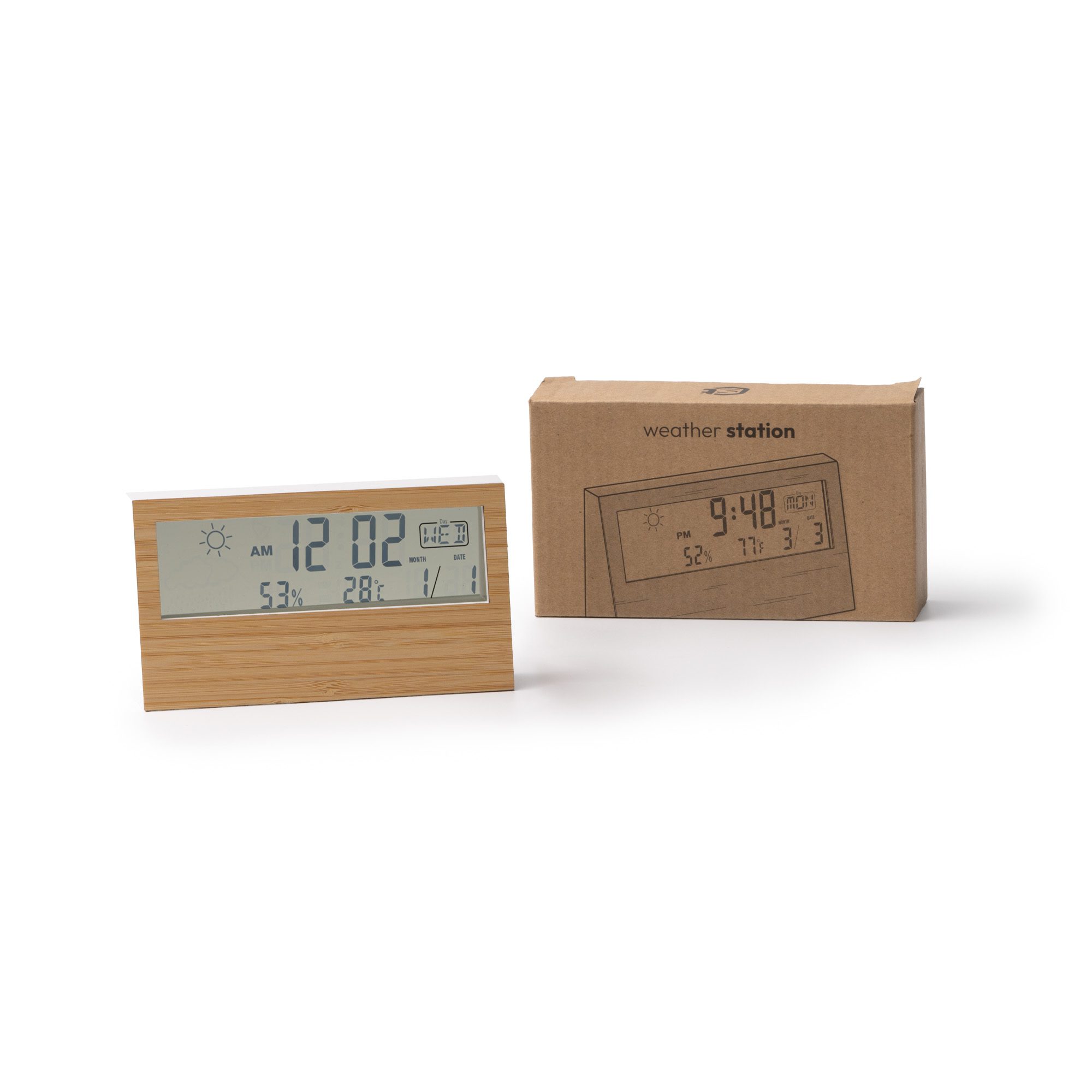 Estación meteorológica con carcasa frontal de bambú. Con pantalla LCD, y botones de ajuste en la parte trasera. Cuenta con funciones adicionales de reloj, calendario y alarma. Con detección automática de temperatura y humedad.