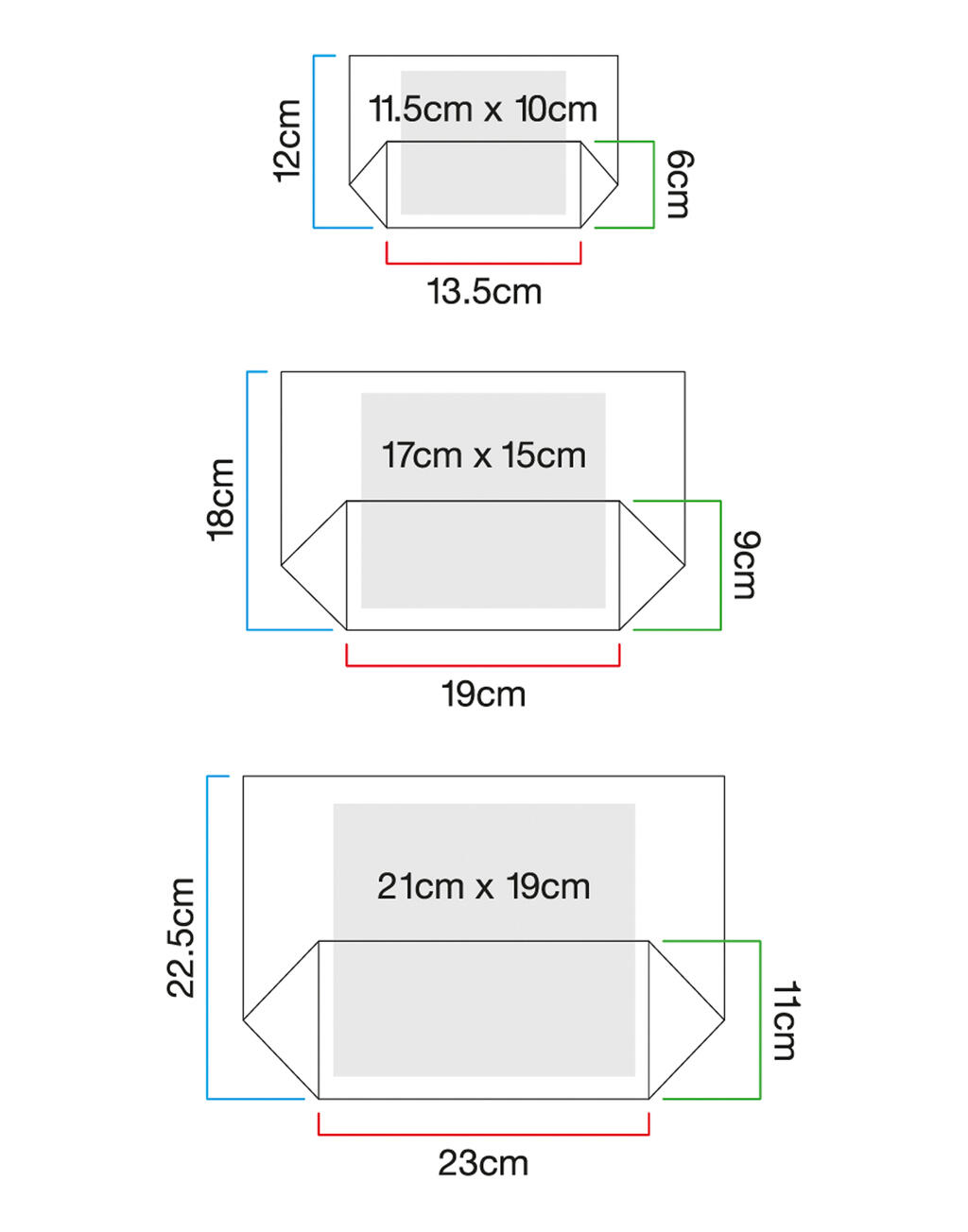 - Medidas en cm: 13.5 x 12 x 6 (S), 19 x 18 x 9 (M), 23 x 22.5 x 11 (L)17 x 7 (S), 26 x 12 (M), 31 x 15 (L)
