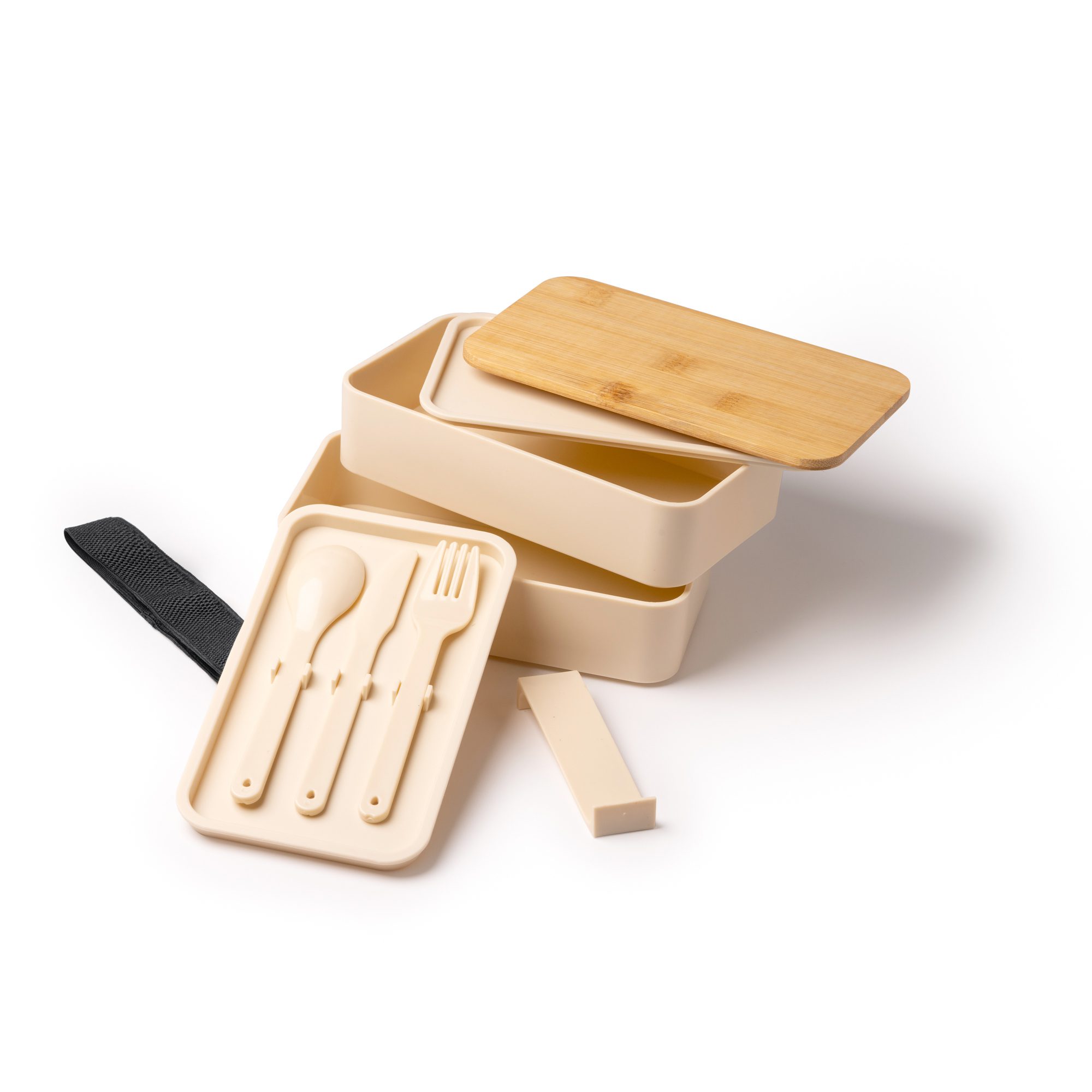 Fiambrera de PP con dos compartimentos apta para alimentos con tapa de bambú. Incluye set de cubiertos integrado en una de las tapas, una pieza separadora extraíble para poder separar diferentes al…
