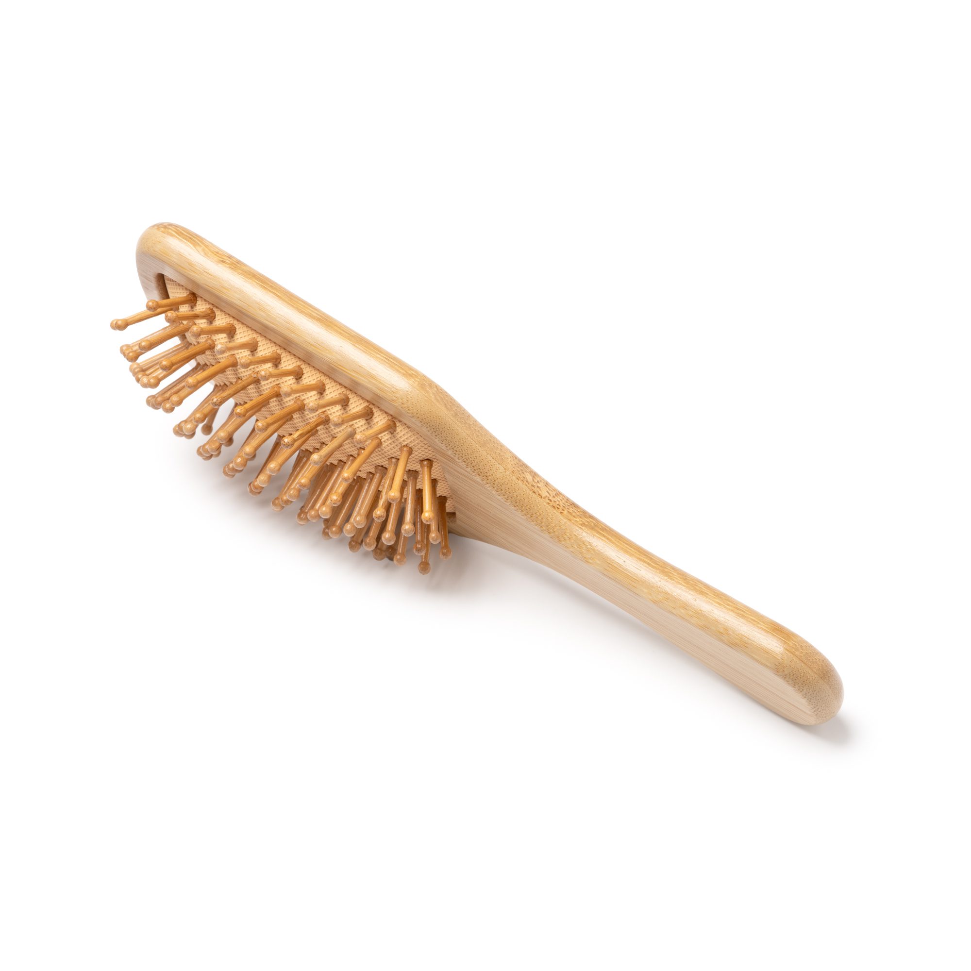 Cepillo para el pelo con cuerpo y cerdas elaboradas en bambú, ideal para un cuidado suave y natural del cabello, promoviendo la sostenibilidad ambiental.