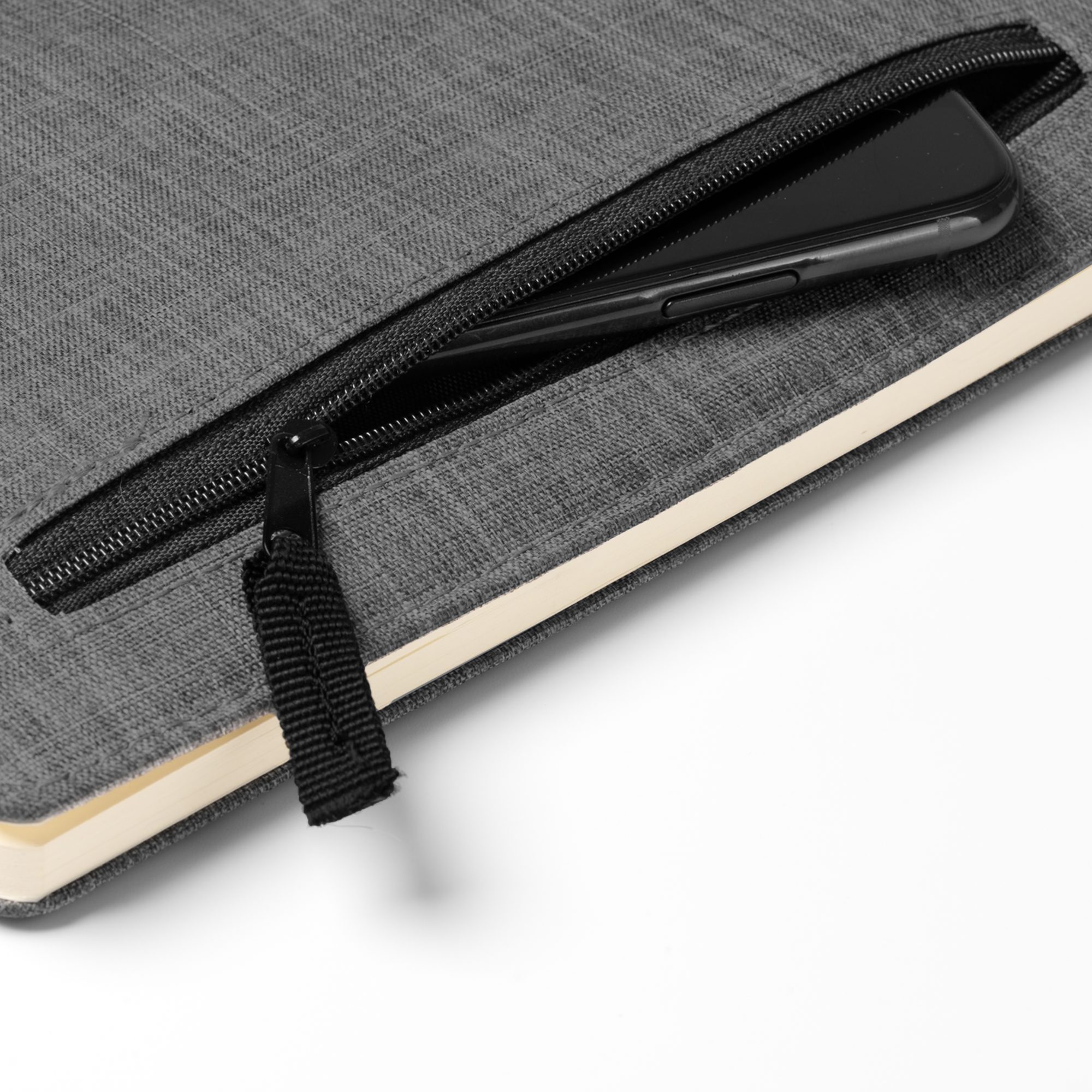 Bloc de notas A5 realizado en RPET. Bolsillo exterior con cierre de cremallera.