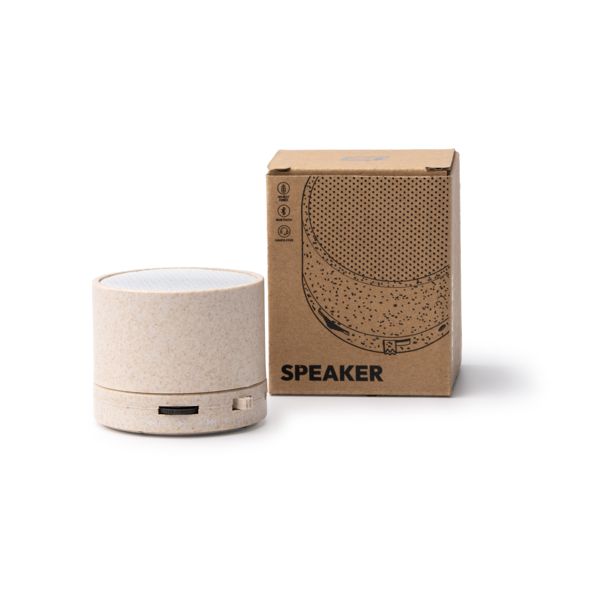Altavoz inalámbrico realizado en fibra de trigo. Con función radio FM, Bluetooth, tarjeta micro SD y manos libres. Cuenta con 3W de potencia y batería recargable. Tiempo de funcionamiento máximo continuo de hasta 3 horas. Reproducción de audio mediante conexión Bluetooth, tarjeta MicroSD, radio FM o mediante entrada Mini Jack. Cuenta con función de manos libres y botones de reproducción multifunción para control de llamadas.