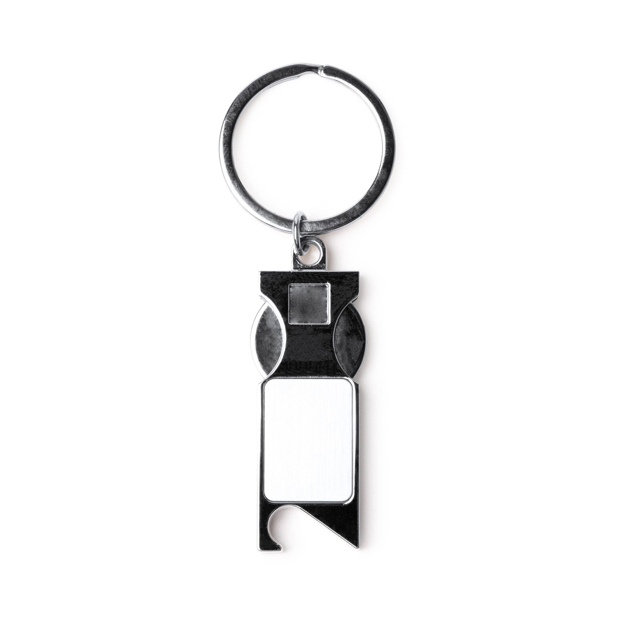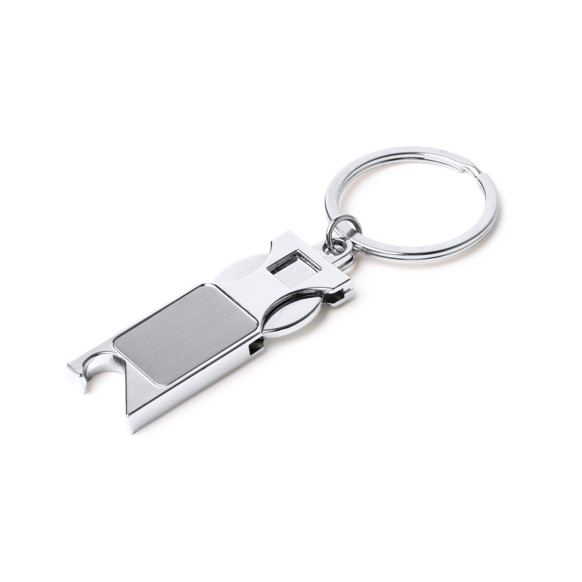 Llavero metálico con moneda extraíble para carro. La moneda puede extraerse por completo e insertarse en espacio diseñado para ello. Cuenta con abridor para botellas en su extremo.