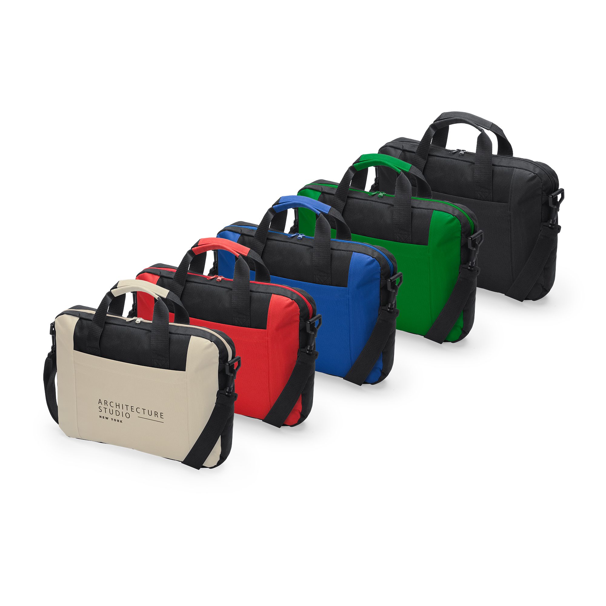 Portadocumentos acolchado para portátil elaborado en suave poliéster 600D con bolsillo exterior. Cuenta con asas de transporte con color a juego y cinta bandolera ajustable con mosquetón para hacerla más cómoda y confortable.