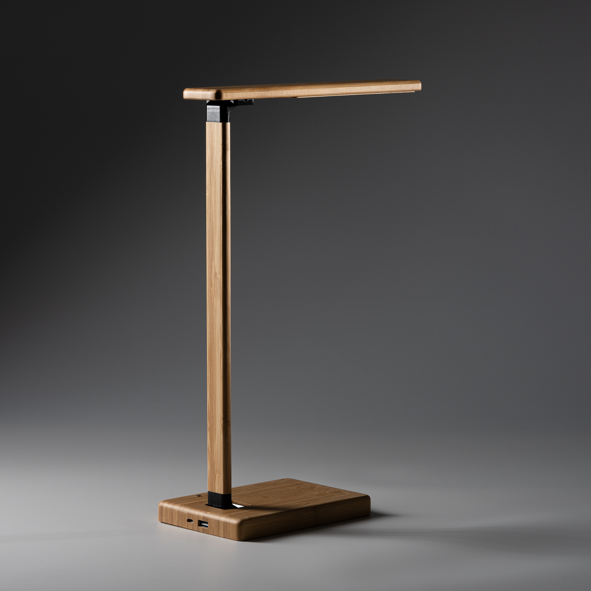 Lámpara plegable con cuerpo elaborado en bambú. Cuenta con superficie de carga inalámbrica en su base, con una potencia de 10W. Con ajuste de intensidad de iluminación mediante botones integrados en la base y temporizador de luz de 1 y 2 horas. Es plegable en ambos ángulos (base y superficie de lámpara). El cargador inalámbrico es compatible con dispositivos provistos de tecnología de carga de este tipo. Con puerto USB de salida para recarga de dispositivos y cable de conexión a corriente Tipo C incluido.