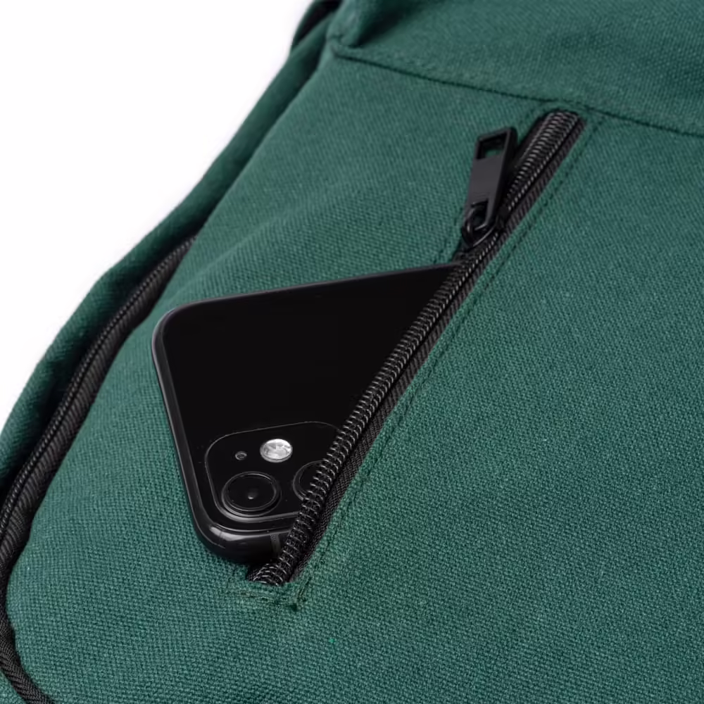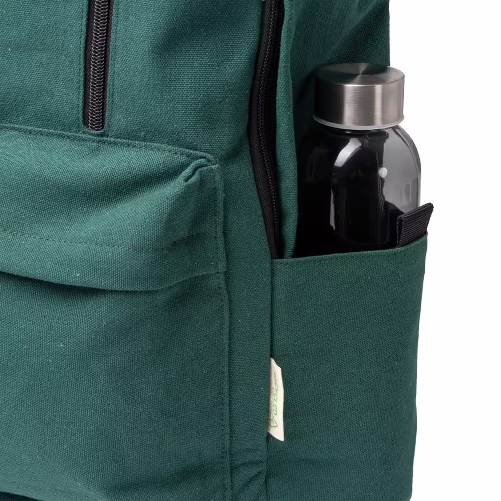 Mochila de algodón reciclado 330 g/m². Cuenta con un gran compartimento principal y con bolsillo interior para el transporte de ordenador portátil o dispositivos de 15″. 2 Bolsillos exteriores con cierre de cremallera y 2 bolsillos laterales. Con asas y espalda acolchadas para mayor confort.