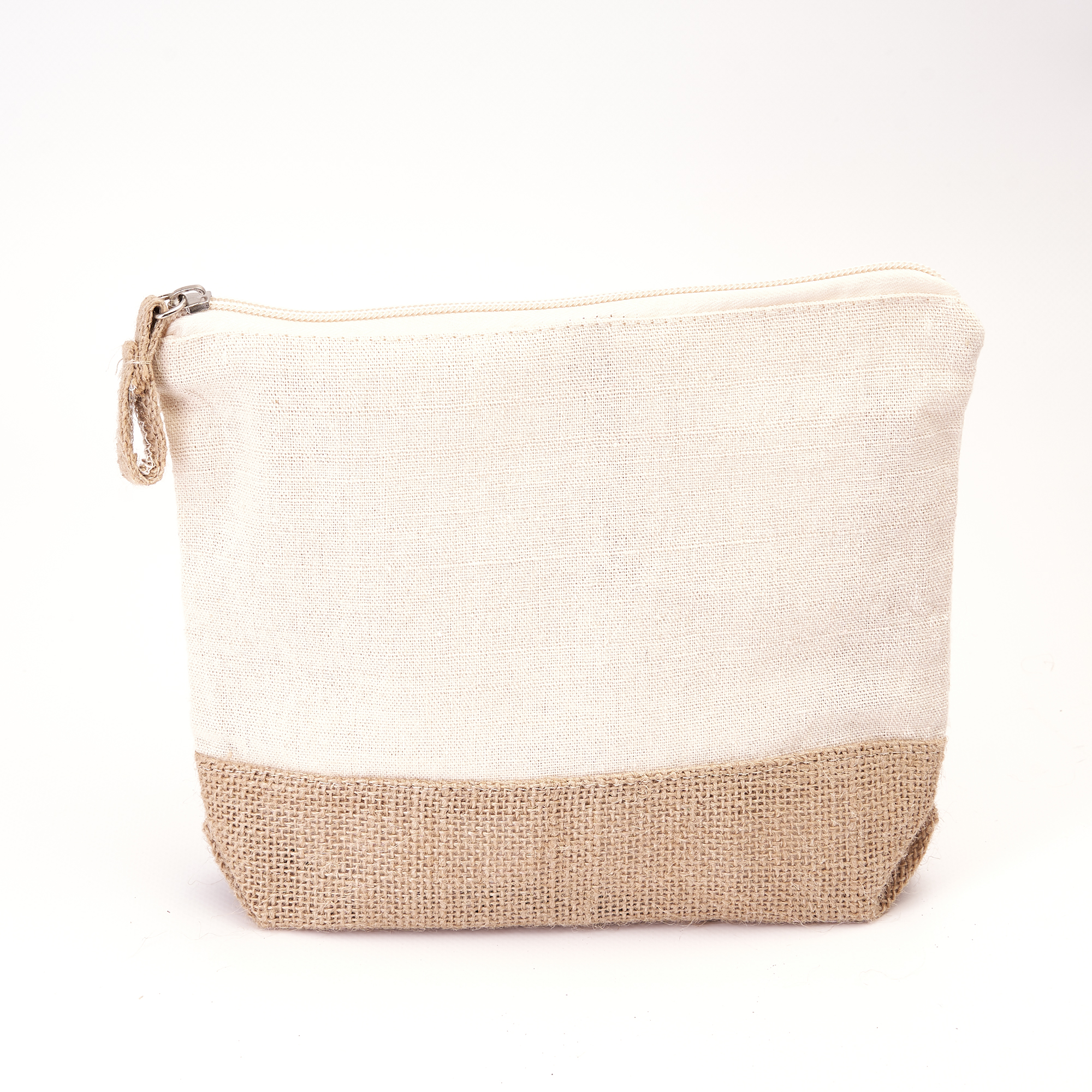 Neceser línea eco de algodón de 180 g/m² y yute en color natural. Base y tirador en yute. Cremallera con tirador de yute a juego.