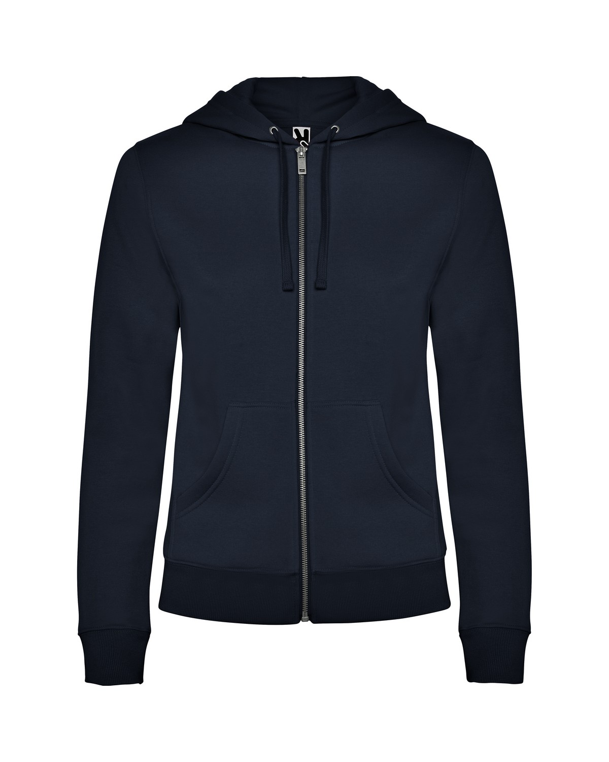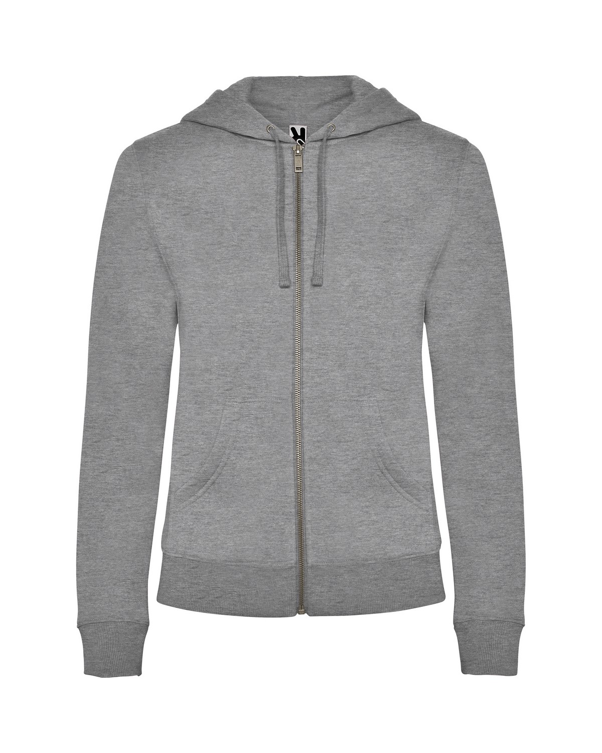 Sudadera de mujer con capucha forrada a tono. Cremallera metálica frontal y bolsillo estilo canguro. Cubre costuras reforzado en el cuello interior. Punto canalé 2×2 en puños y cintura. Corte entallado.