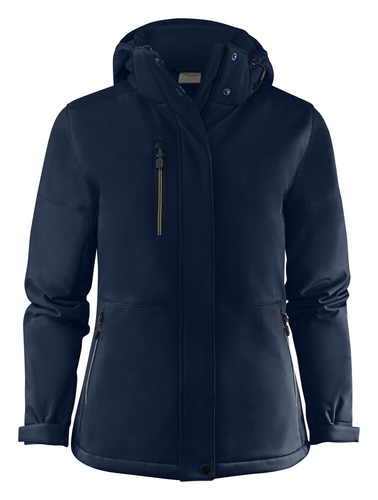 Chaqueta softshell acolchada con capucha desmontable. Tapa con cremallera y botones de presión delanteros. Tiras de velcro ajustables en el bajo de las mangas y cordón elástico en la capucha y en la costura inferior. Dos bolsillos interiores con crem
