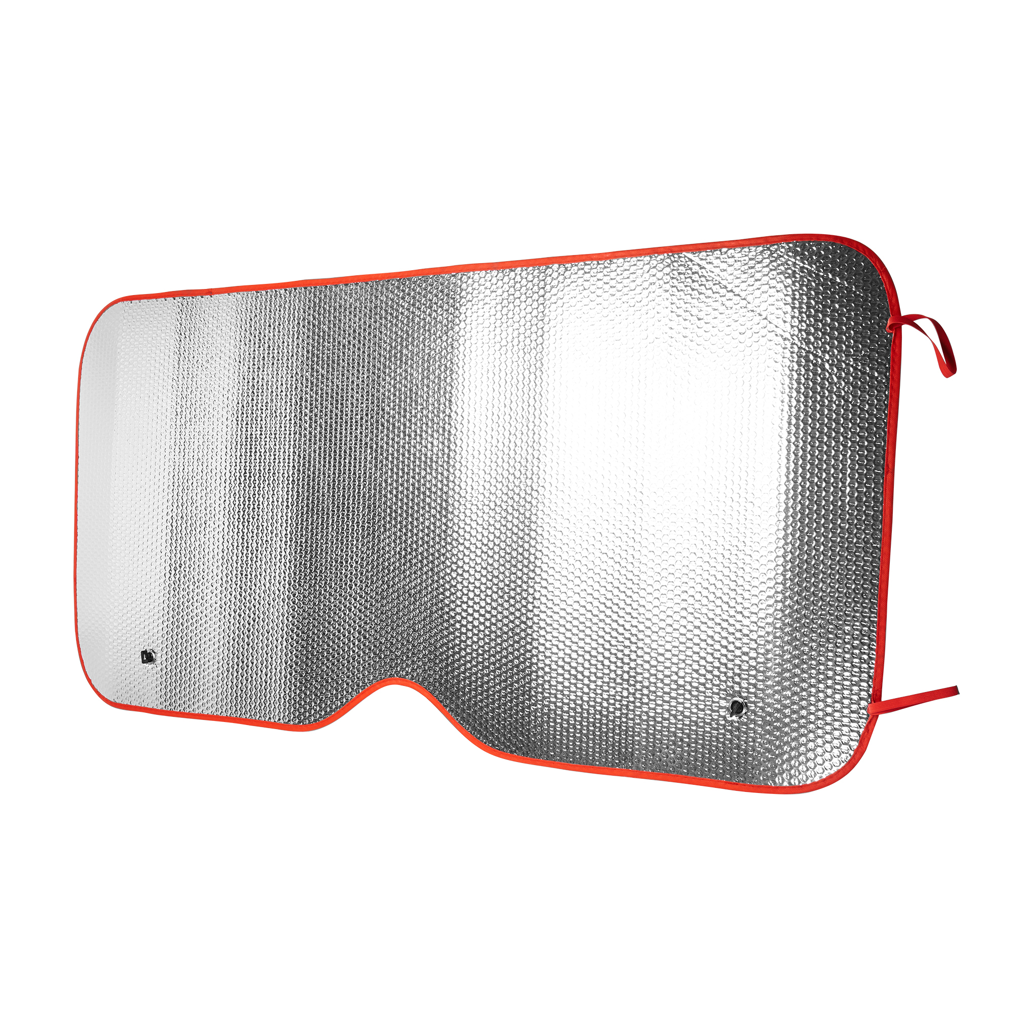 Parasol para coche con burbujas a doble cara en aluminio. Dos orificios en ambas esquinas superiores para la introducción de ventosas de sujeción a la luna del vehículo. Ribete y gomas elásticas para su enrollado en color. Incluye ventosas.
