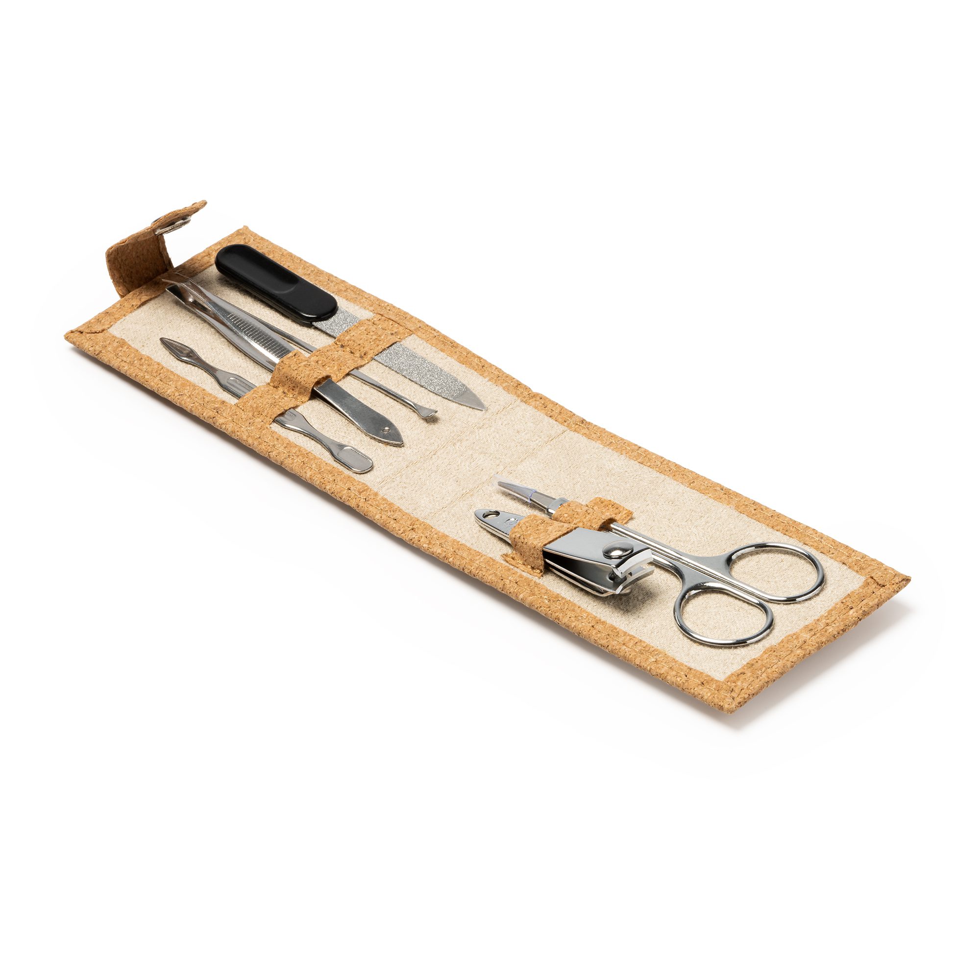 Set de manicura con funda de corcho y cierre de corchete. Incluye tijeras, pinzas, cortaúñas, lima y quita cutículas de acero inoxidable.