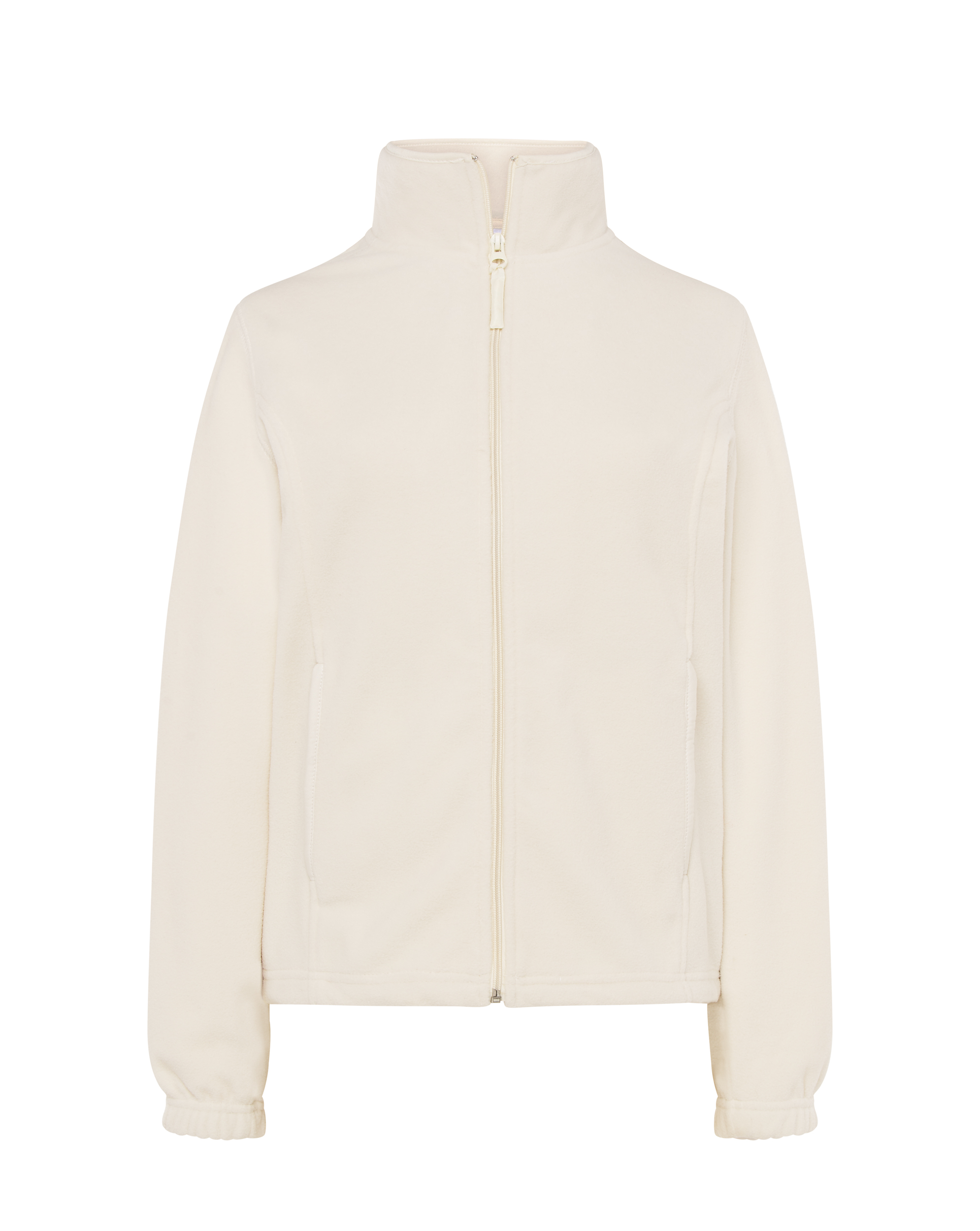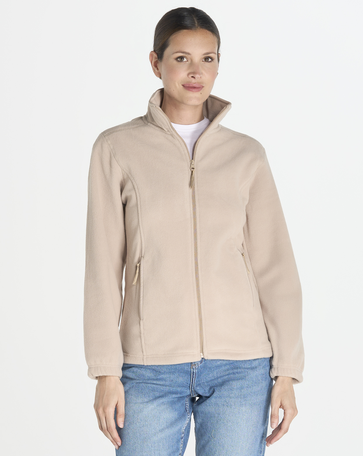 Forro polar entallado de mujer con cremallera entera, bolsillos laterales con cremallera, cordón de ajuste con topes y elástico en puños, 100% poliéster reciclado. Acabado micropolar antipilin para evitar la aparición de «bolitas». Ideal para trabajos en exteriores, actividades de montaña o al aire libre porque proporciona una buena protección contra el frío. Disponible en 18 colores desde la talla XS hasta la XXL.