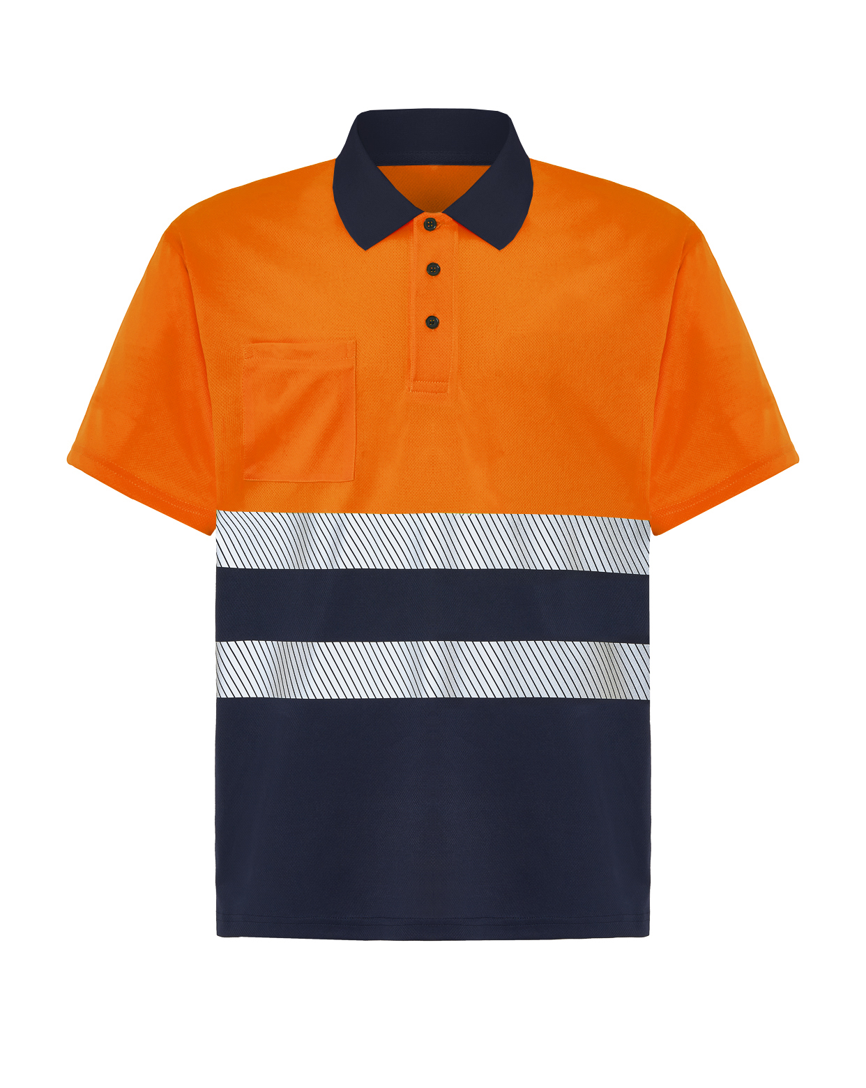 Polo manga corta AV.Características: Cuello canalé 1X1.Tapeta con 3 botones.Cubrecosturas en cuello.Doble costura en mangas y bajo.Bolsillo en pecho derecho.Dos cintas reflectantes segmentadas, termoselladas en torso.Tratamiento iones de plata.
