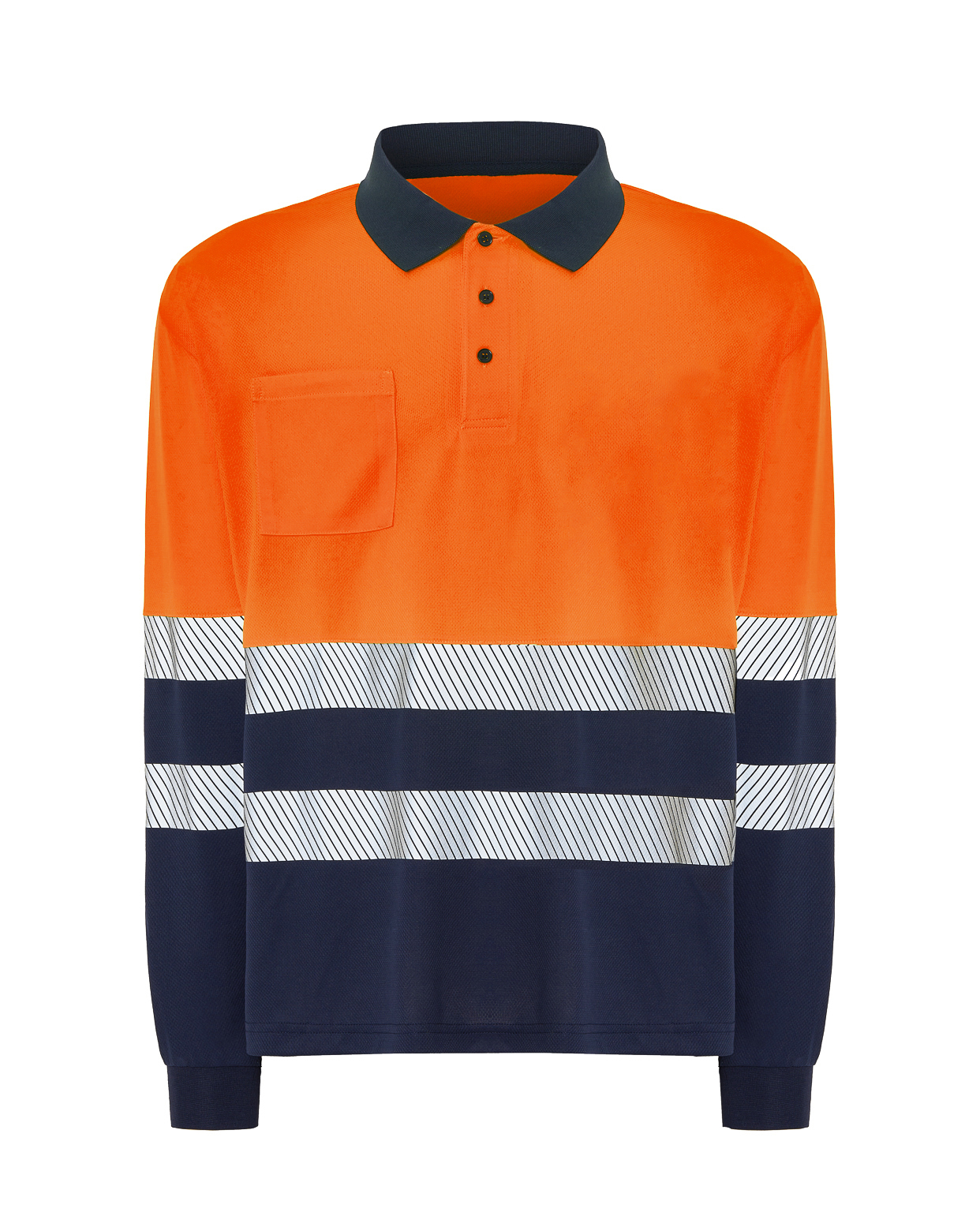 Polo manga larga AV.Características: Cuello y bocamanga canalé 1X1.Tapeta con 3 botones.Cubrecosturas en cuello.Bolsillo en pecho derecho.Dos cintas reflectantes segmentadas, termoselladas en torso y mangas.Tratamiento iones de plata.
