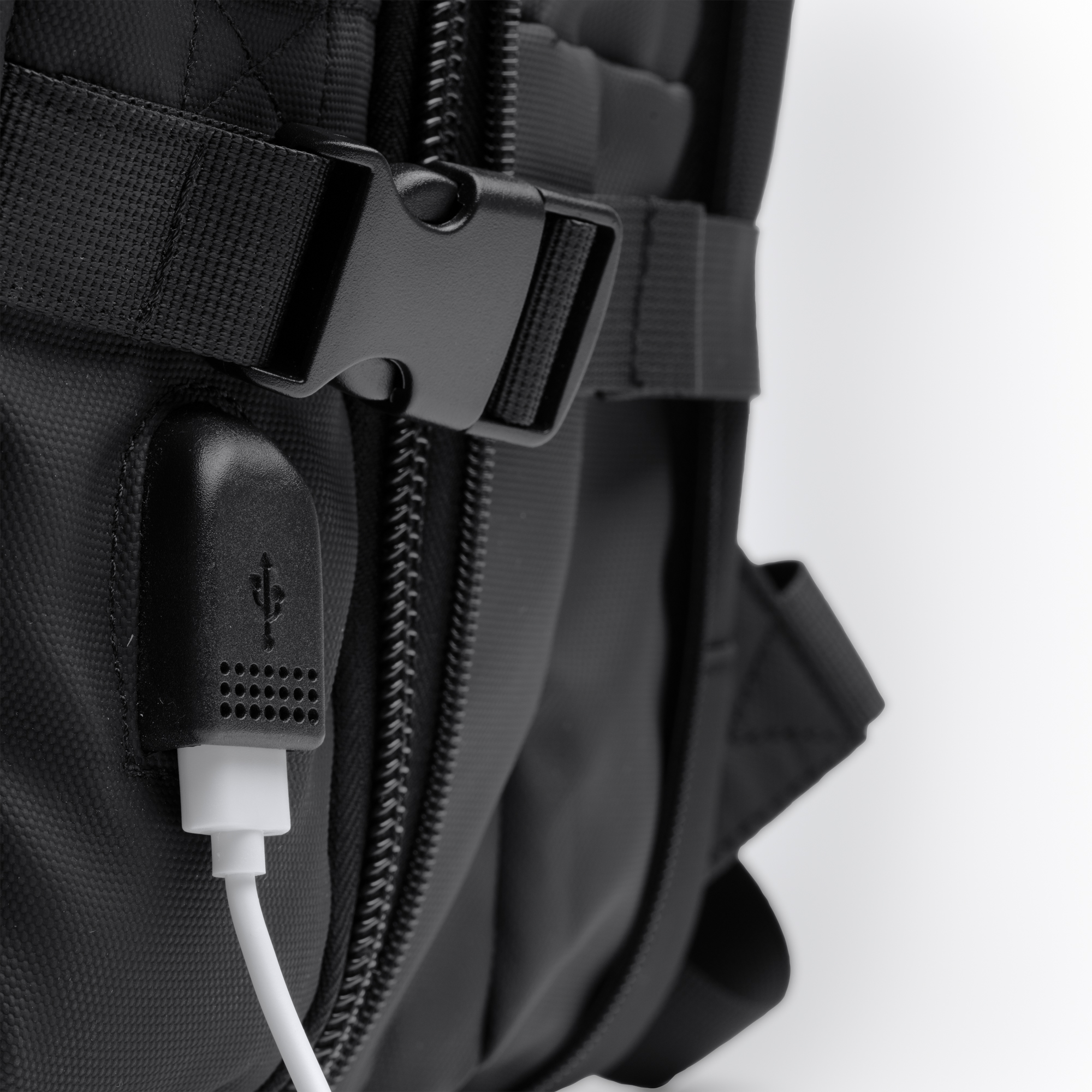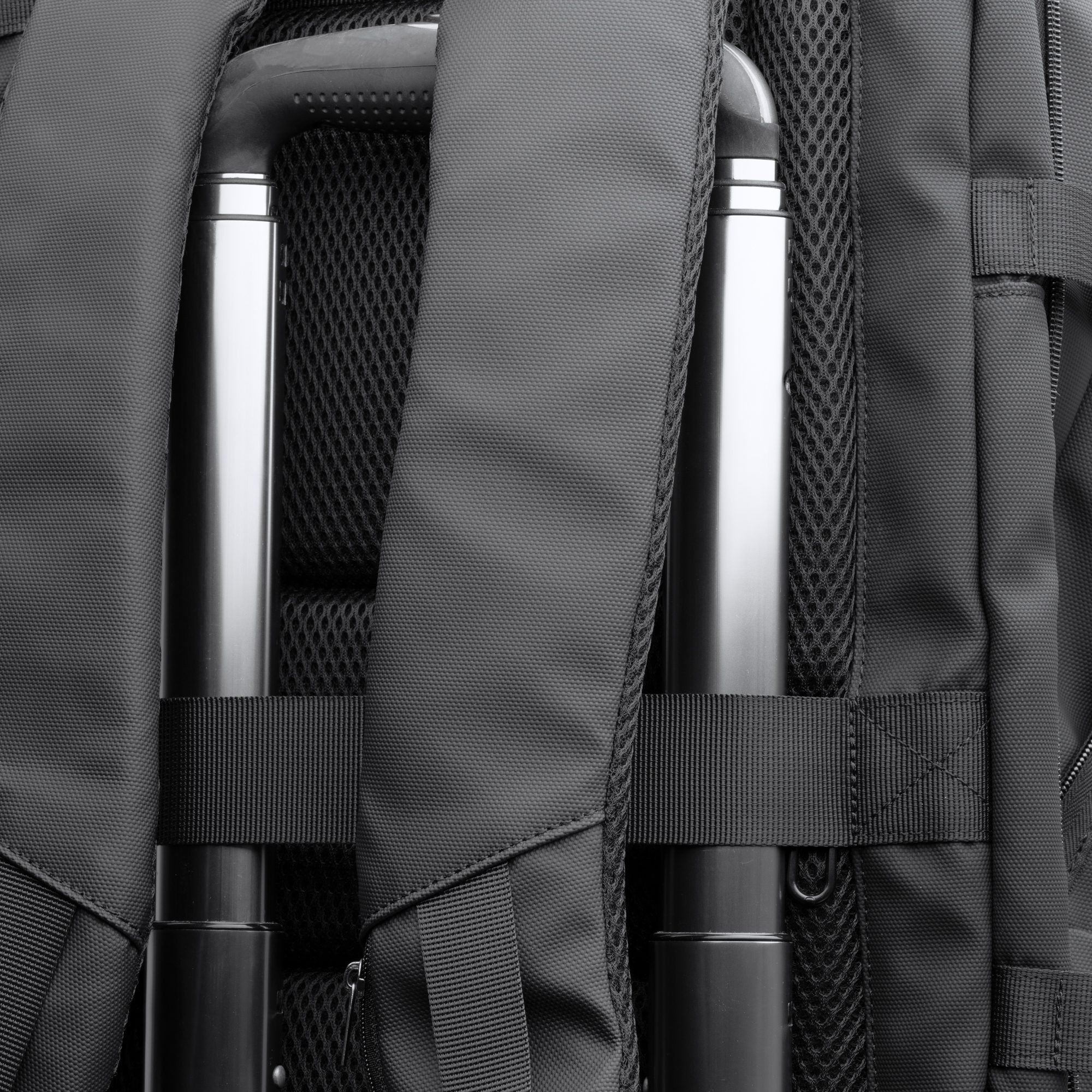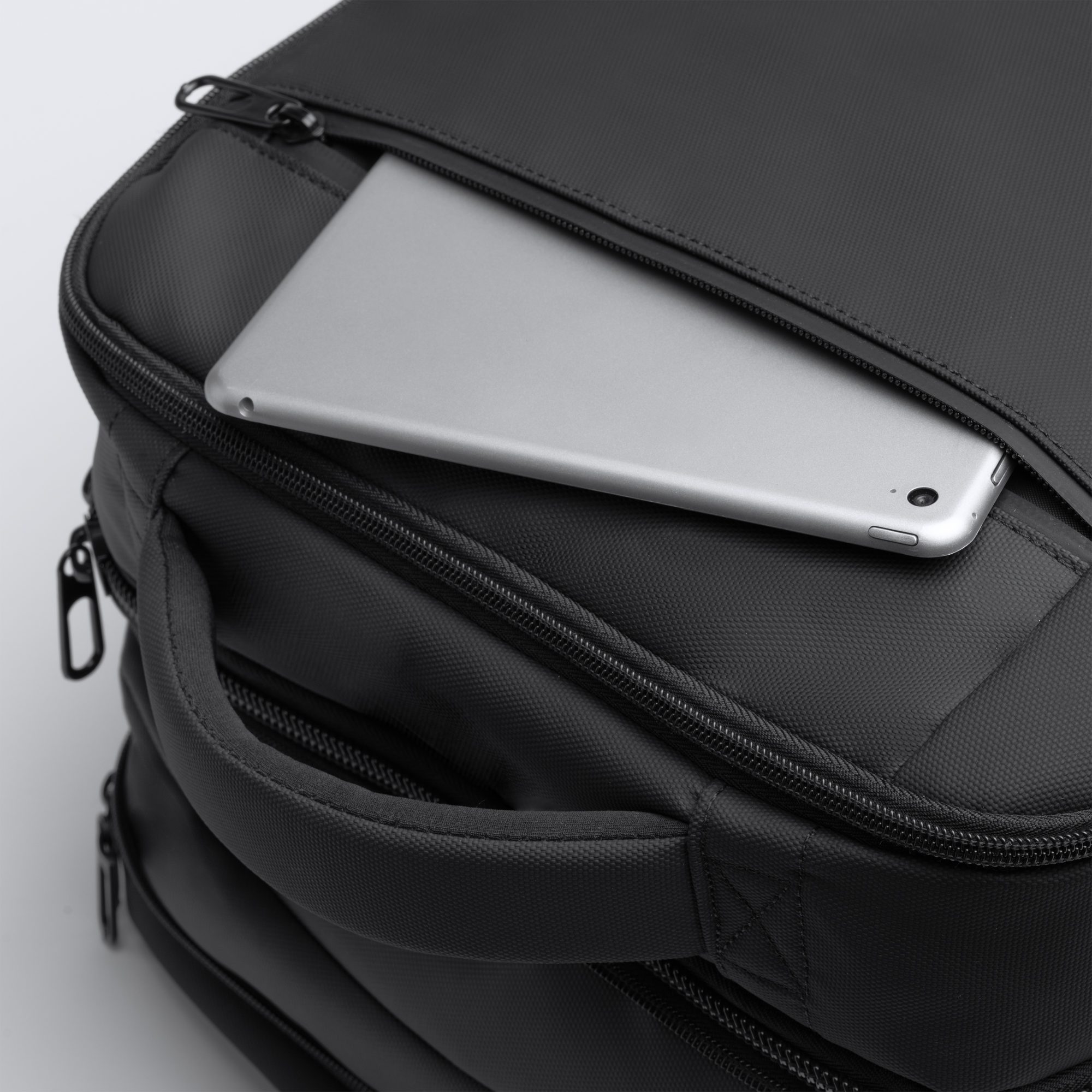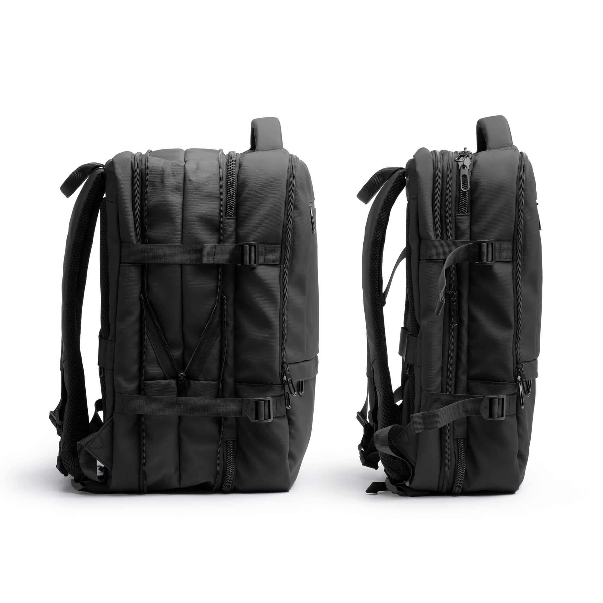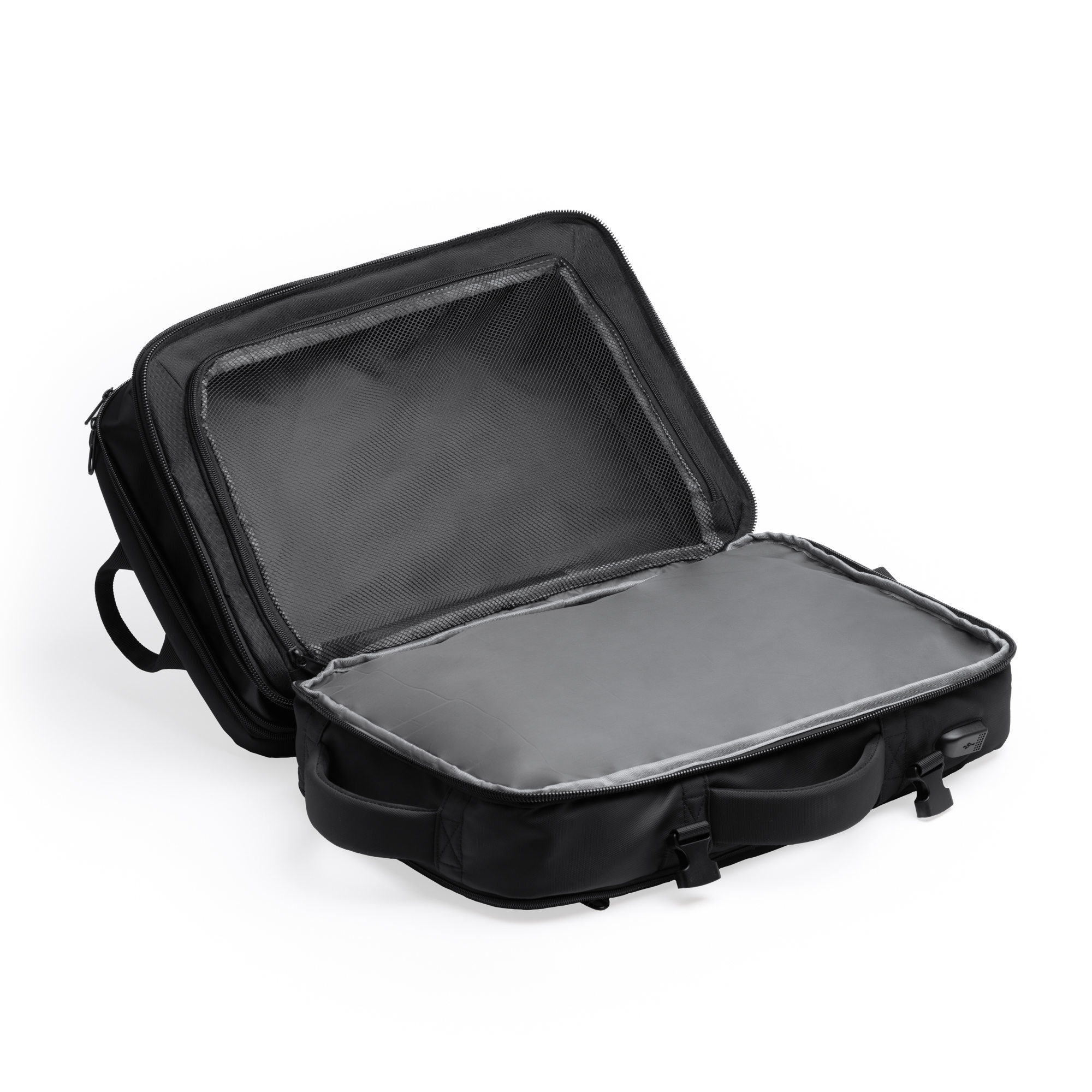 La mochila de viaje extensible realizada en PU Leather ofrece gran capacidad y confort con espalda y asas acolchadas. Incluye bolsillo exterior frontal con cierre de cremallera. Cuenta con tres compartimentos de equipaje. El primero cuenta con bolsillos internos de almacenamiento para pequeños objetos. El central cuenta con rejilla especial separadora y otro compartimento especialmente acolchado para ordenadores y otros dispositivos. También equipada con bolsillos antirrobo en la parte trasera y en el asa izquierda, además de cable conector integrado para batería externa y cinta para trolley. Con capacidad de 40L.