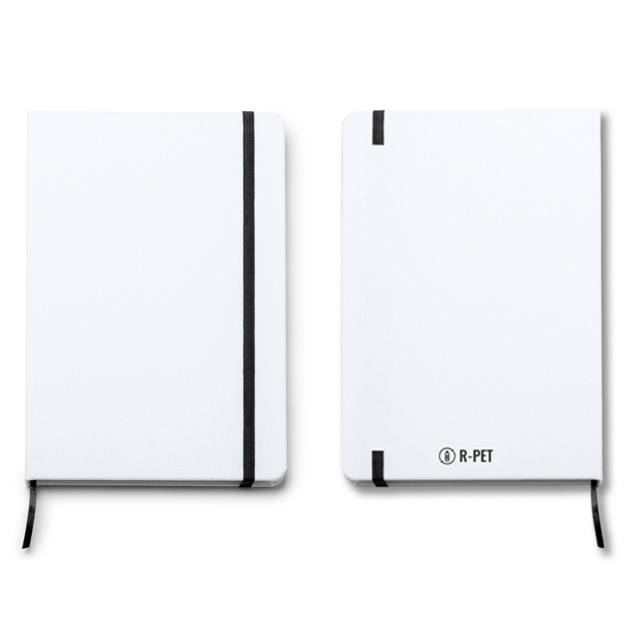 Bloc de notas tamaño A5 ideal para sublimación de tapa rígida. Incluye marcador de páginas y banda elástica de cierre a juego.