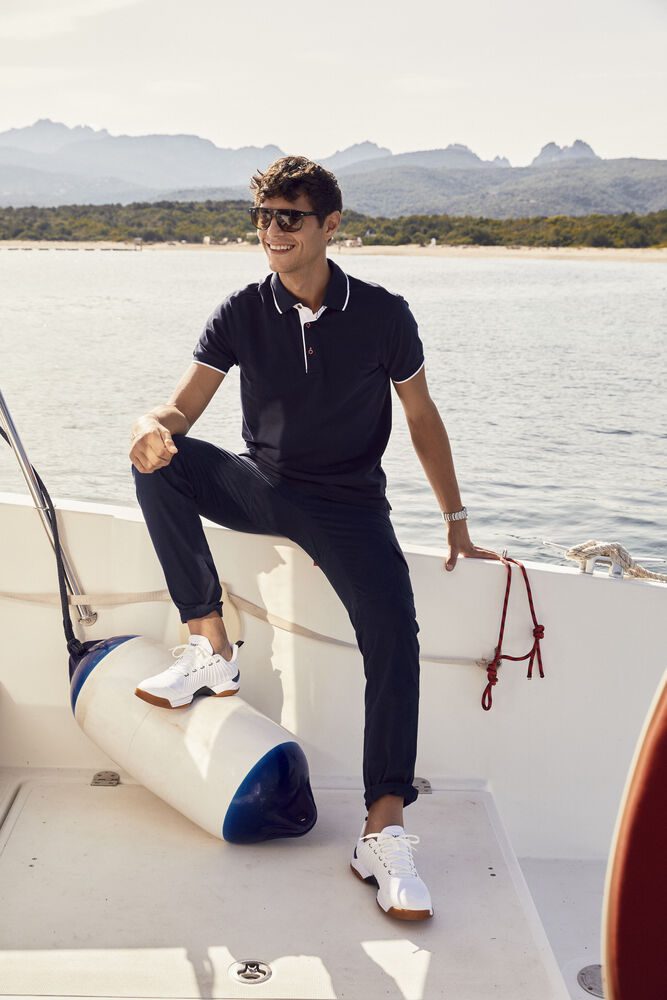 Polo piqué de manga corta con contraste a color en botones, tapeta y aberturas laterales. Tapeta con tres botones, 5 en la versión femenina. Raya a contraste en mangas y cuello.