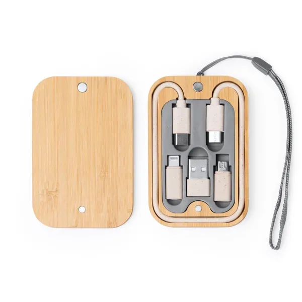 Set de cables cargadores realizados en fibra de trigo. Cable principal con clavijas de entrada y salida Tipo C con adaptadores Lightning, Micro USB y USB. Presentados en estuche de bambú con tapa imantada. Incluye práctica asa para transporte.