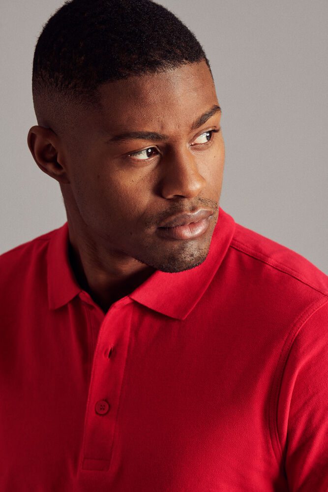 Polo piqué manga corta, aberturas laterales y elástico en mangas.