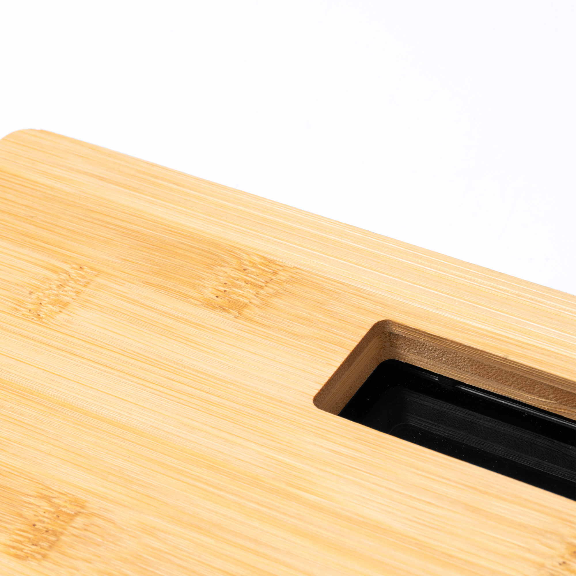 Báscula de bambú con base antideslizante. Panel digital con funciones peso y temperatura.