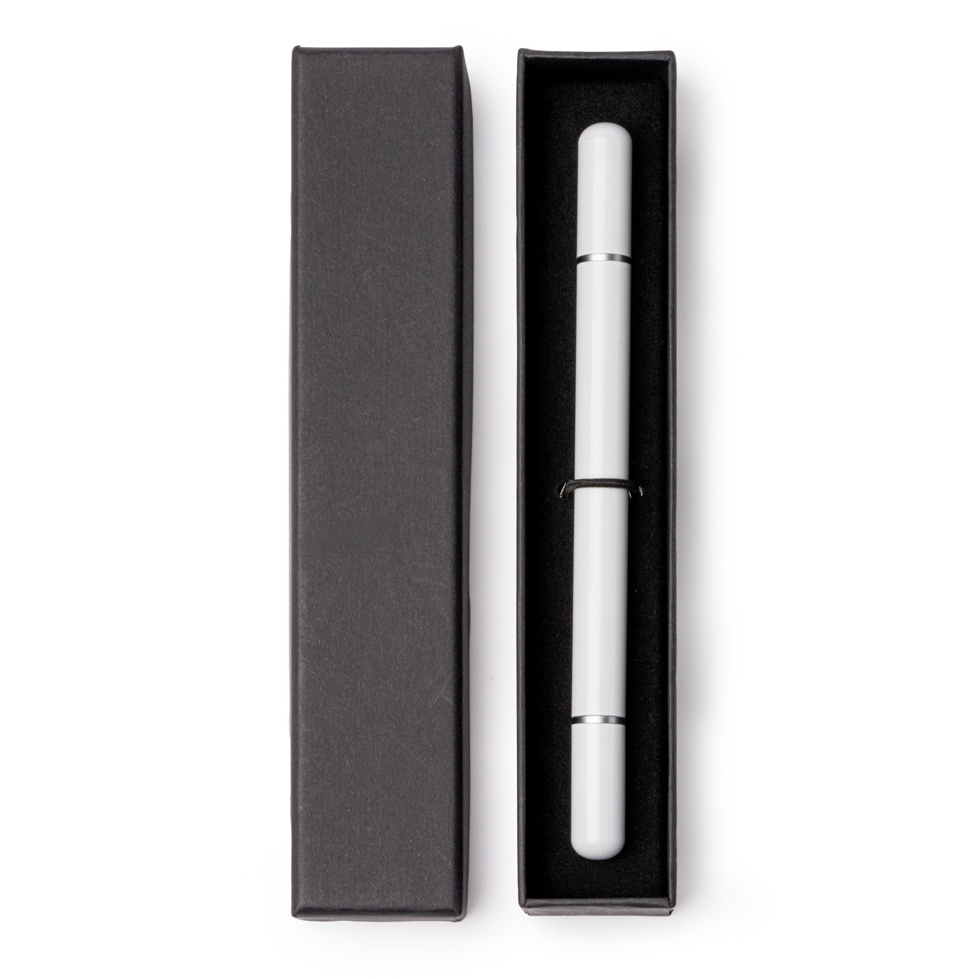 Bolígrafo lápiz infinito 2 en 1 con cuerpo metálico. Cuenta con bolígrafo de carga jumbo de tinta azul en uno de sus extremos y en el opuesto, lápiz de punta infinita, ambos con tapa. Presentación individual en estuche negro individual con acolchado interior.