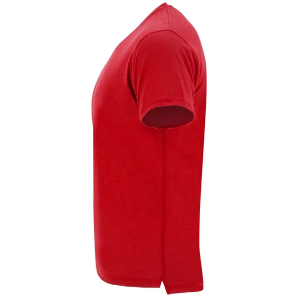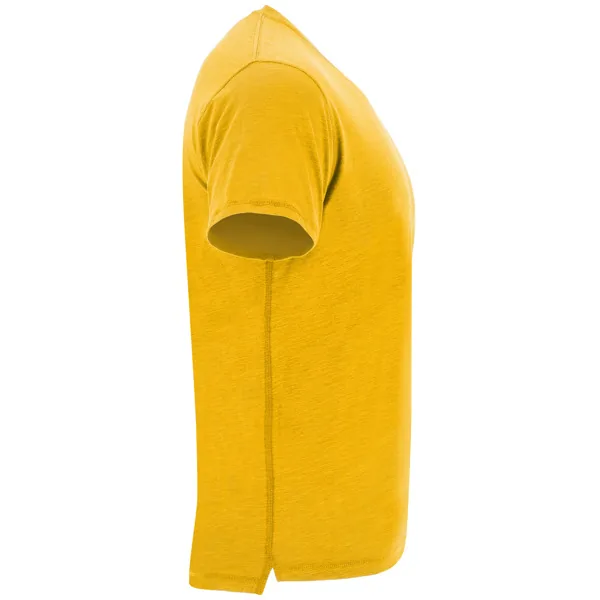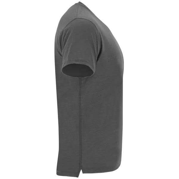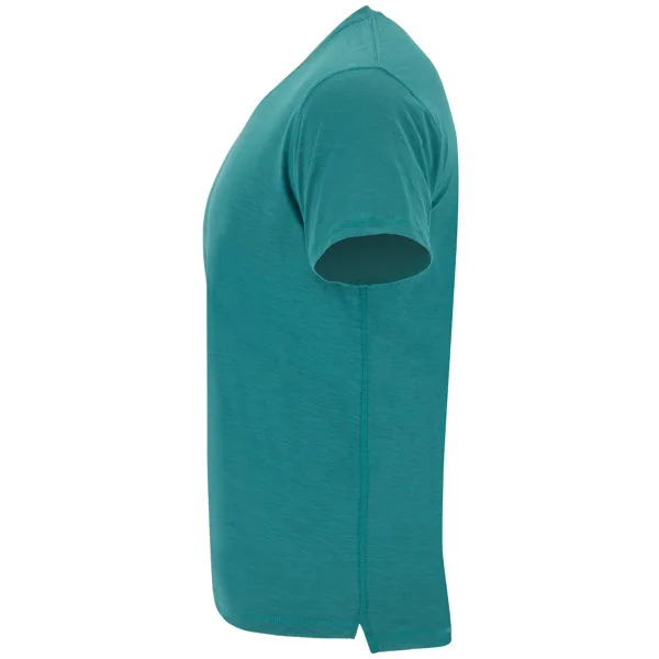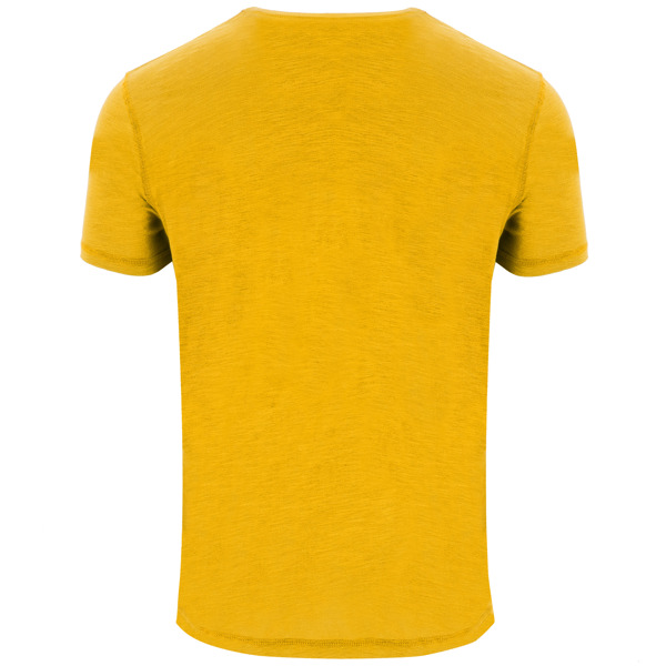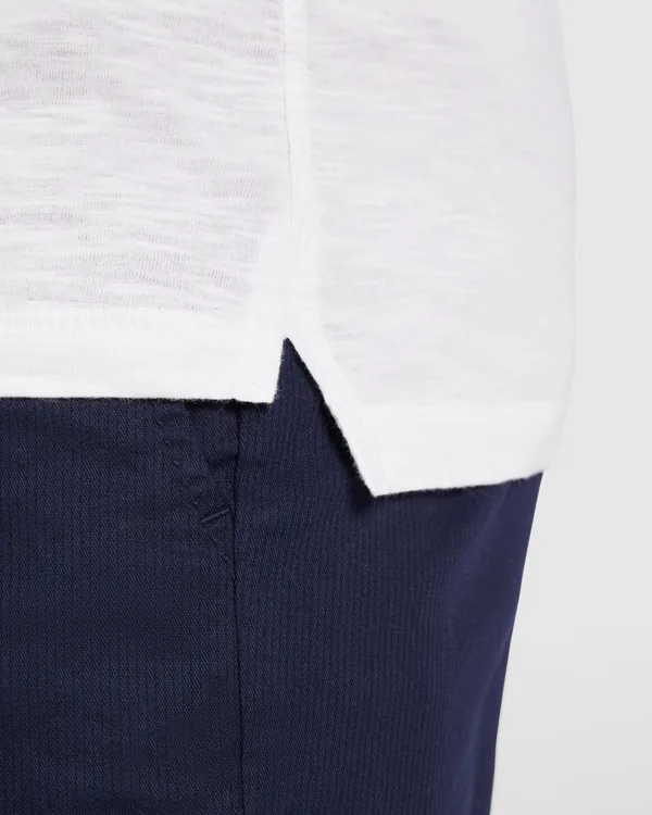 Camiseta de manga corta, en tejido vigoré inclinado. Cuello redondo del mismo tejido. Cubrecosturas interior a contraste de hombro a hombro. Costuras laterales remalladas de adorno. Bajo con aperturas laterales y el patronaje de la espalda es ligeramente más largo que el delantero.