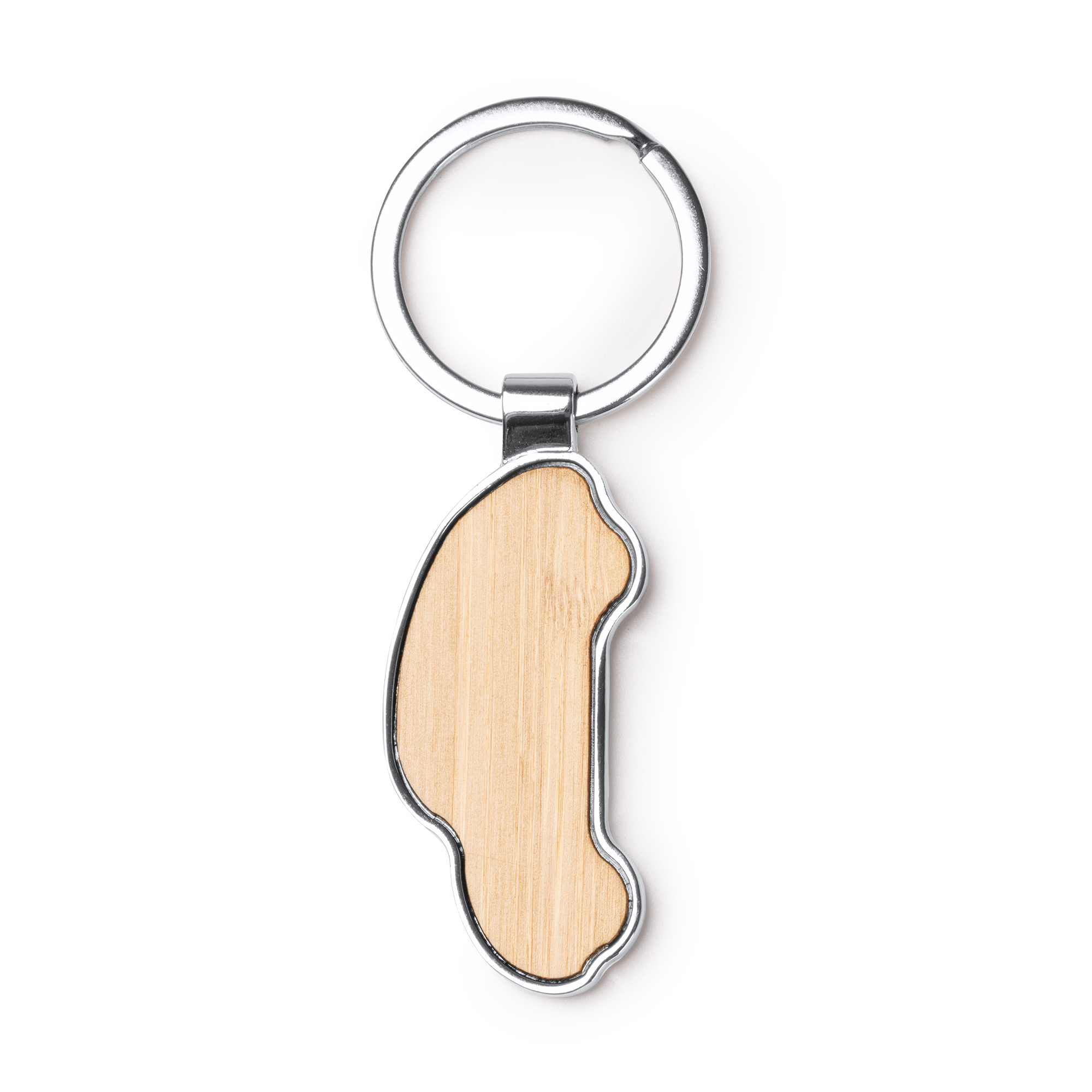 Llavero en forma de coche elaborado en bambú con acabado de metal. Una opción elegante y sostenible para llevar tus llaves con estilo.