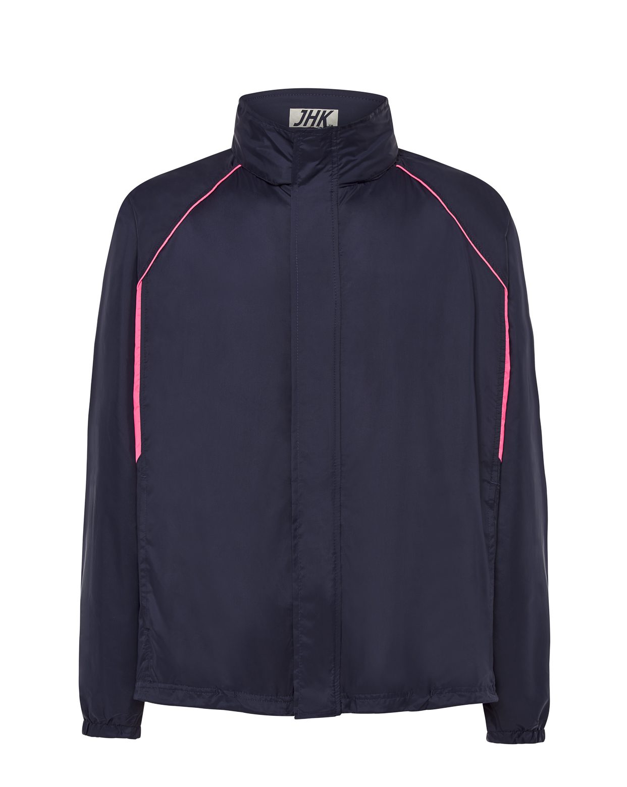 Cortavientos de hombre con cremallera entera, bolsillos laterales, puños ajustables, capucha con corchetes y ribete decorativo en contraste. Disponible desde la talla XS hasta la XXL.