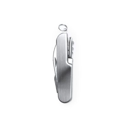 Navaja multiusos de acero inoxidable con 6 funciones: cuchillo, abridor, abrelatas, descorchador, destornillador y llavero. Composición: Aluminio y acero inoxidable.