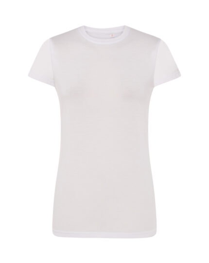 Camiseta de mujer de manga corta para sublimar. 100% poliéster. Tacto de algodón. Etiqueta removible.Características:Doble costura en mangas y bajo.Etiqueta removible