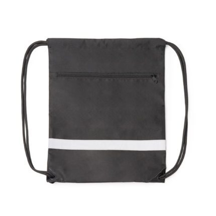 Mochila de cuerdas ajustables elaborada en RPET 300D. Dispone de un bolsillo frontal con cierre de cremallera y de una cinta reflectante horizontal que ofrece mayor visibilidad.