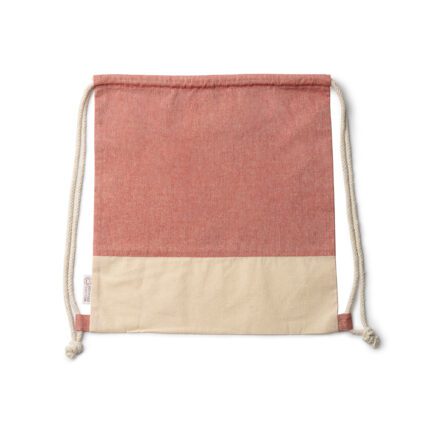 Mochila de cordones elaborado en algodón reciclado, con acabado jaspeado en la parte superior y color natural en la parte inferior en algodón natural. Con cordones en color natural.