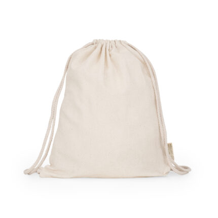Mochila de cuerdas combinada 70% algodón reciclado y 30% poliéster reciclado de 140g/m² en color natural. Una opción sostenible y respetuosa con el medio ambiente para transportar tus enseres perso...