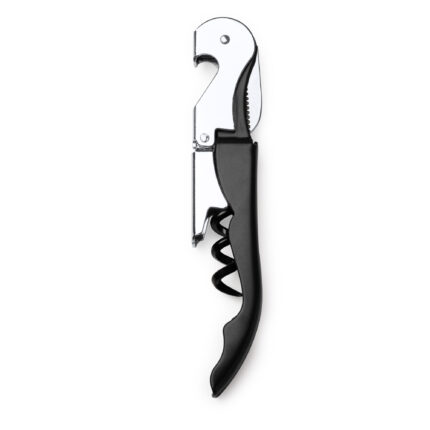 Sacacorchos de estilo clásico en acero inoxidable con dos posiciones. Cuenta con un accesorio en el extremo con función de corte en sierra.