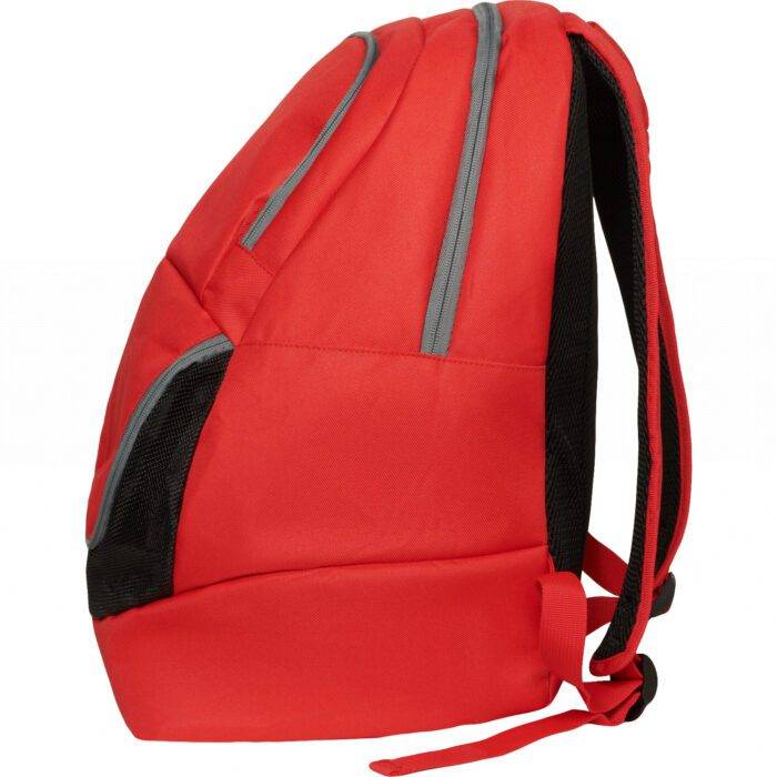Mochila deportiva con diseño ergonómico y de fácil personalización. Doble asa reforzada para hombros y asa especial de mano. Respaldo acolchado. Bolsillo zapatillero de acceso frontal. Un bolsillo principal con doble tirador y un bolsillo frontal exterior de menor capacidad. Cremalleras a contraste en color gris. Detalles en color negro.